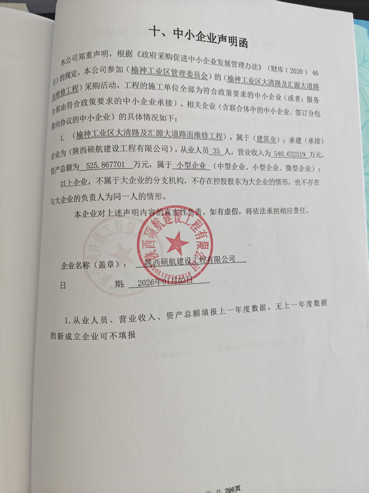 公告概要:| 公告信息: | | 采购项目名称 | 榆神工业区大清路及汇源大道路面维修工程 | | 品目 | | | 采购单位 | 榆神工业区管理委员会 | | 行政区域 | 榆神工业区 | 公告时间 | 2026年01月08日 15:41 | | 评审专家(单一来源采购人员)名单 | 尚凤羽,常杨,胡艳 | | 总成交金额 | ¥40.100000 万元(人民币) | | 联系人及联系方式: | | 项目联系人 | 福盛昌顺经办 | | 项目联系电话 | 13484849689 | | 采购单位 | 榆神工业区管理委员会 | | 采购单位地址 | 陕西省榆林市榆神工业区清水工业园 | | 采购单位联系方式 | 18609126181 | | 代理机构名称 | 陕西福盛昌顺项目管理有限公司 | | 代理机构地址 | 陕西省榆林市高新技术产业园区中央公园25号楼2单元1402室 | | 代理机构联系方式 | 13484849689 | | 附件: | | 附件1 | 榆神工业区大清路及汇源大道路面维修工程.pdf | | 附件2 | 中小企业声明函.jpg | | 附件3 | 榆神工业区管理委员会榆神工业区大清路及汇源大道路面维修工程中标(成交)明细.pdf |