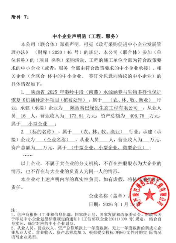 旬阳市林业技术推广站陕西省2025年秦岭中段(南麓)水源涵养与生物多样性保护恢复飞机播种造林项目(植被处理)中标(成交)结果公告