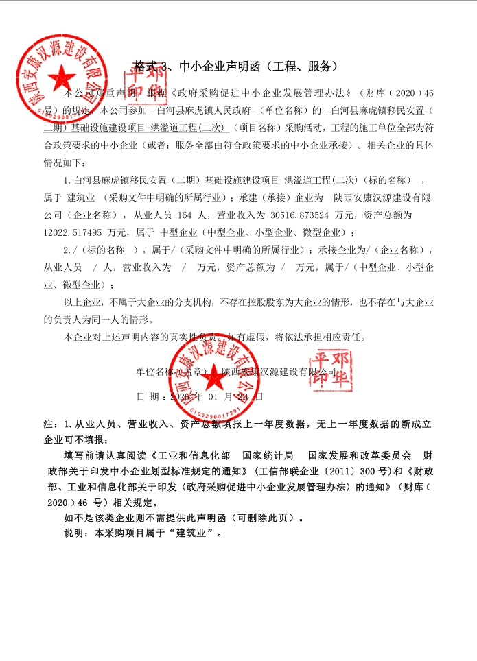 公告概要:| 公告信息: | | 采购项目名称 | 白河县麻虎镇移民安置(二期)基础设施建设项目-洪溢道工程(二次) | | 品目 | | | 采购单位 | 白河县麻虎镇人民政府 | | 行政区域 | 白河县 | 公告时间 | 2026年01月20日 16:18 | | 评审专家(单一来源采购人员)名单 | 姚国琪,赵晓安,李金元,唐红梅,卢琳 | | 总成交金额 | ¥248.188000 万元(人民币) | | 联系人及联系方式: | | 项目联系人 | 徐工 | | 项目联系电话 | 0915-3204657 | | 采购单位 | 白河县麻虎镇人民政府 | | 采购单位地址 | 陕西省安康市白河县麻虎镇康银村六组 | | 采购单位联系方式 | 19297651101 | | 代理机构名称 | 陕西正恒忠卫工程管理服务有限公司 | | 代理机构地址 | :陕西省安康市汉滨区江北大道汉城国际二号楼一单元1002 | | 代理机构联系方式 | 0915-3204657 | | 附件: | | 附件1 | 汉源中小企业声明函.png | | 附件2 | 白河县麻虎镇人民政府白河县麻虎镇移民安置(二期)基础设施建设项目-洪溢道工程(二次)中标(成交)明细.pdf |