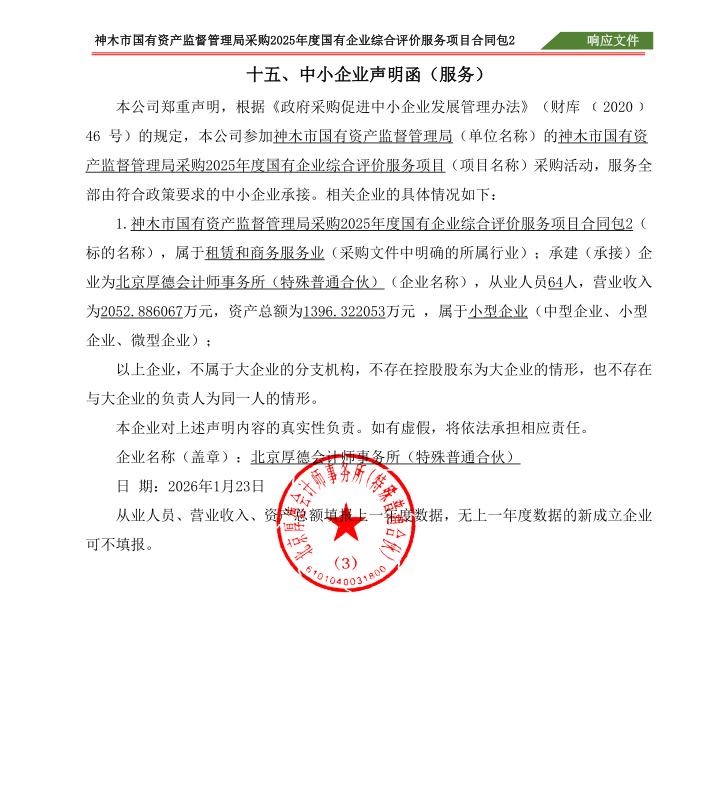 一、项目编号:安立景和采〔2026〕2号 二、项目名称:采购2025年度国有企业综合评价服务项目 三、采购结果 采购包2: | 供应商名称 | 供应商地址 | 中标(成交)金额 | 评审总得分 | | 北京厚德会计师事务所(特殊普通合伙) | 北京市朝阳区裕民路12号1号楼23层A2301 | 635,000.00元 | 82.17 | 四、主要标的信息 合同包2(神木市国有资产监督管理局采购2025年度国有企业综合评价服务项目合同包2): 服务类(北京厚德会计师事务所(特殊普通合伙)) | 品目号 | 品目名称 | 采购标的 | 服务范围 | 服务要求 | 服务时间 | 服务标准 | 金额(元) | | 2 | 会计鉴证服务 | 2025年度国有企业综合评价服务项目 | 2025年度国有企业综合评价服务项目 | 符合采购人要求,确保服务达到最佳状态 | 合同签订后三个月内 | 提供的服务必须满足磋商文件 | 635,000.00 | 五、评审专家(单一来源采购人员)名单: 六、代理服务收费标准及金额: | 代理服务收费标准及金额 | 采购代理机构参照国家计委关于印发《招标代理服务收费管理暂行办法》的通知(计价格〔2002〕1980 号)、《国家发展和改革委员会办公厅关于招标代理服务收费有关问题的通知》(发改办价格〔2003〕857号)服务类标准计取。 | | 合同包号 | 合同包名称 | 代理服务费金额(万元) | 收取对象 | | 2 | 神木市国有资产监督管理局采购2025年度国有企业综合评价服务项目合同包2 | 0.9525 | 中标(成交)供应商 | 七、公告期限 自本公告发布之日起1个工作日。 八、其他补充事宜 九、凡对本次公告内容提出询问,请按以下方式联系。 1.采购人信息 名称:神木市国有资产监督管理局 地址:陕西省神木市滨河新区街道广场西侧水利大楼4楼408室 联系方式:18392599918 2.采购代理机构信息 名称:榆林安立景和工程管理有限公司 地址:陕西省榆林市榆阳区陕西省榆林市榆阳区文化路耀泽碧云苑2号楼1101室 联系方式:15529589876 3.项目联系方式 项目联系人:谢工 电话:19719121313 榆林安立景和工程管理有限公司 2026年01月26日 |