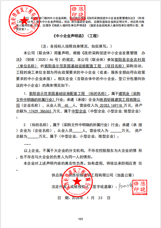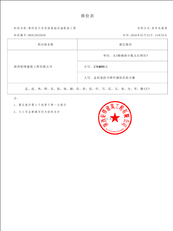 公告概要:| 公告信息: | | 采购项目名称 | 紫阳县示范茶园基础设施配套工程 | | 品目 | | | 采购单位 | 紫阳县农业农村局 | | 行政区域 | 紫阳县 | 公告时间 | 2026年01月26日 14:25 | | 评审专家(单一来源采购人员)名单 | 毛泽军,王易婵,徐成勇,马翔,高立成 | | 总成交金额 | ¥170.489000 万元(人民币) | | 联系人及联系方式: | | 项目联系人 | 李工 | | 项目联系电话 | 15319833335 | | 采购单位 | 紫阳县农业农村局 | | 采购单位地址 | 紫阳县城关镇环城二路 | | 采购单位联系方式 | 18717576000 | | 代理机构名称 | 恒德建设项目管理有限公司 | | 代理机构地址 | 陕西省西安市雁塔区陕西省西安市雁塔区太白南路甲字6号上上城B区3幢1单元11119号房 | | 代理机构联系方式 | 15319833335 | | 附件: | | 附件1 | 紫阳县农业农村局紫阳县示范茶园基础设施配套工程中标(成交)明细.pdf | | 附件2 | 二次报价单.png | | 附件3 | 中小企业声明函.png |
