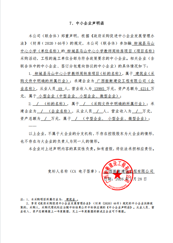 公告概要:| 公告信息: | | 采购项目名称 | 柳城县马山中心小学教师周转房项目 | | 品目 | | | 采购单位 | 柳城县马山中心小学 | | 行政区域 | 广西壮族自治区 | 公告时间 | 2026年01月29日 09:16 | | 评审专家(单一来源采购人员)名单 | 王艳萍,江丽文(第1分标采购人代表),郑哲一 | | 总成交金额 | ¥172.970000 万元(人民币) | | 联系人及联系方式: | | 项目联系人 | 余鹰 | | 项目联系电话 | 0772-3728990 | | 采购单位 | 柳城县马山中心小学 | | 采购单位地址 | 柳城县马山中心小学内 | | 采购单位联系方式 | 0772-7761273 | | 代理机构名称 | 广西千信项目管理有限公司 | | 代理机构地址 | 柳州市三中路140号柳州市恒达巴士股份有限公司10楼1003室 | | 代理机构联系方式 | 0772-3728990 |