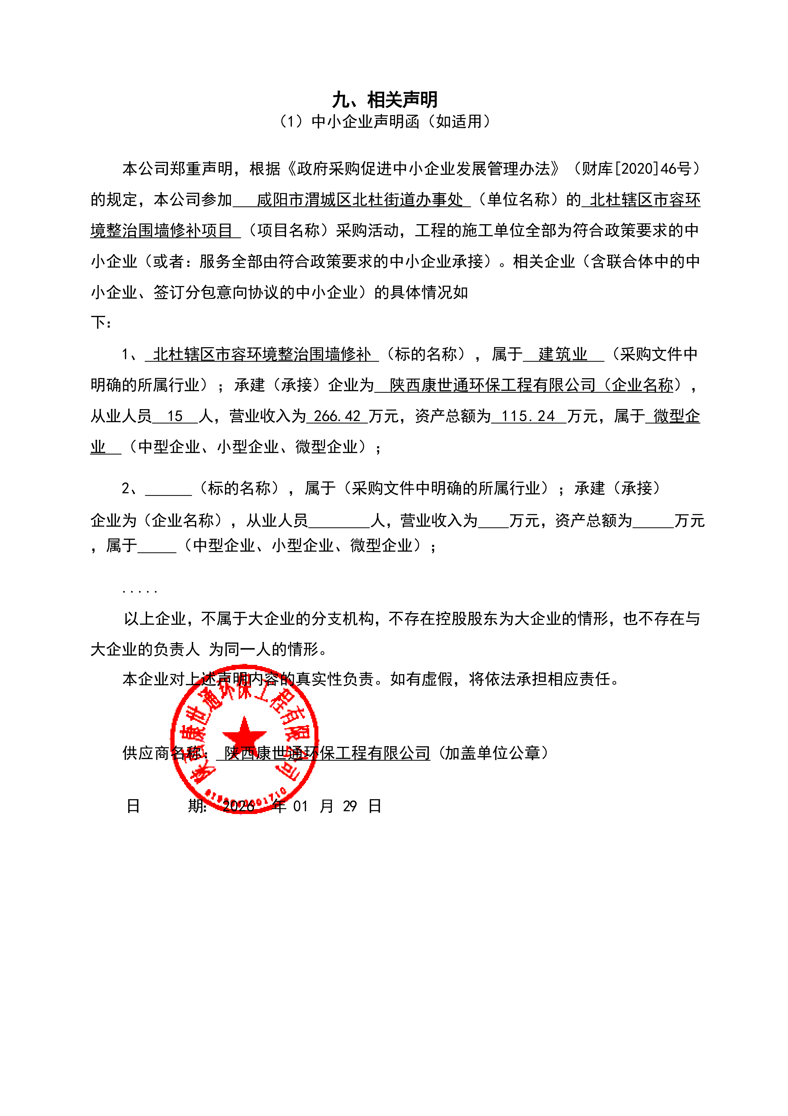 一、项目编号:XXGC-2026-000004-4 二、项目名称:北杜辖区市容环境整治围墙修补项目 三、采购结果 采购包1: | 供应商名称 | 供应商地址 | 中标(成交)金额 | 评审总得分 | | 陕西康世通环保工程有限公司 | 陕西省西咸新区秦汉新城周陵街办王车大村095号 | 2,009,857.22元 | 87.67 | 四、主要标的信息 合同包1(北杜辖区市容环境整治围墙修补项目): 工程类(陕西康世通环保工程有限公司) | 品目号 | 品目名称 | 采购标的 | 施工范围 | 施工工期 | 项目经理 | 执业证书信息 | 金额(元) | | 1 | 其他建筑工程 | 北杜辖区市容环境整治围墙修补项目 | 北杜辖区市容环境整治围墙修补 | 合同签订之日起30天 | 金青松 | 610481197601290011 | 2,009,857.22 | 五、评审专家(单一来源采购人员)名单: 六、代理服务收费标准及金额: | 代理服务收费标准及金额 | 参考《国家计委关于印发<招标代理服务收费管理暂行办法>的通知》(计价格〔2002〕1980号)规定的“工程招标”计费标准,按照差额定率累进法计算,招标代理服务费由成交单位支付。 | | 合同包号 | 合同包名称 | 代理服务费金额(万元) | 收取对象 | | 1 | 北杜辖区市容环境整治围墙修补项目 | 1.7 | 中标(成交)供应商 | 七、公告期限 自本公告发布之日起1个工作日。 八、其他补充事宜 九、凡对本次公告内容提出询问,请按以下方式联系。 1.采购人信息 名称:咸阳市渭城区北杜街道办事处 地址:陕西省西咸新区空港新城北杜街道办 联系方式:029-33115170 2.采购代理机构信息 名称:西安建工建设工程招标有限公司 地址:西咸新区沣西新城先河之星1902室 联系方式:029-38025288 3.项目联系方式 项目联系人:卞江 电话:029-38025288 西安建工建设工程招标有限公司 2026年01月30日 |