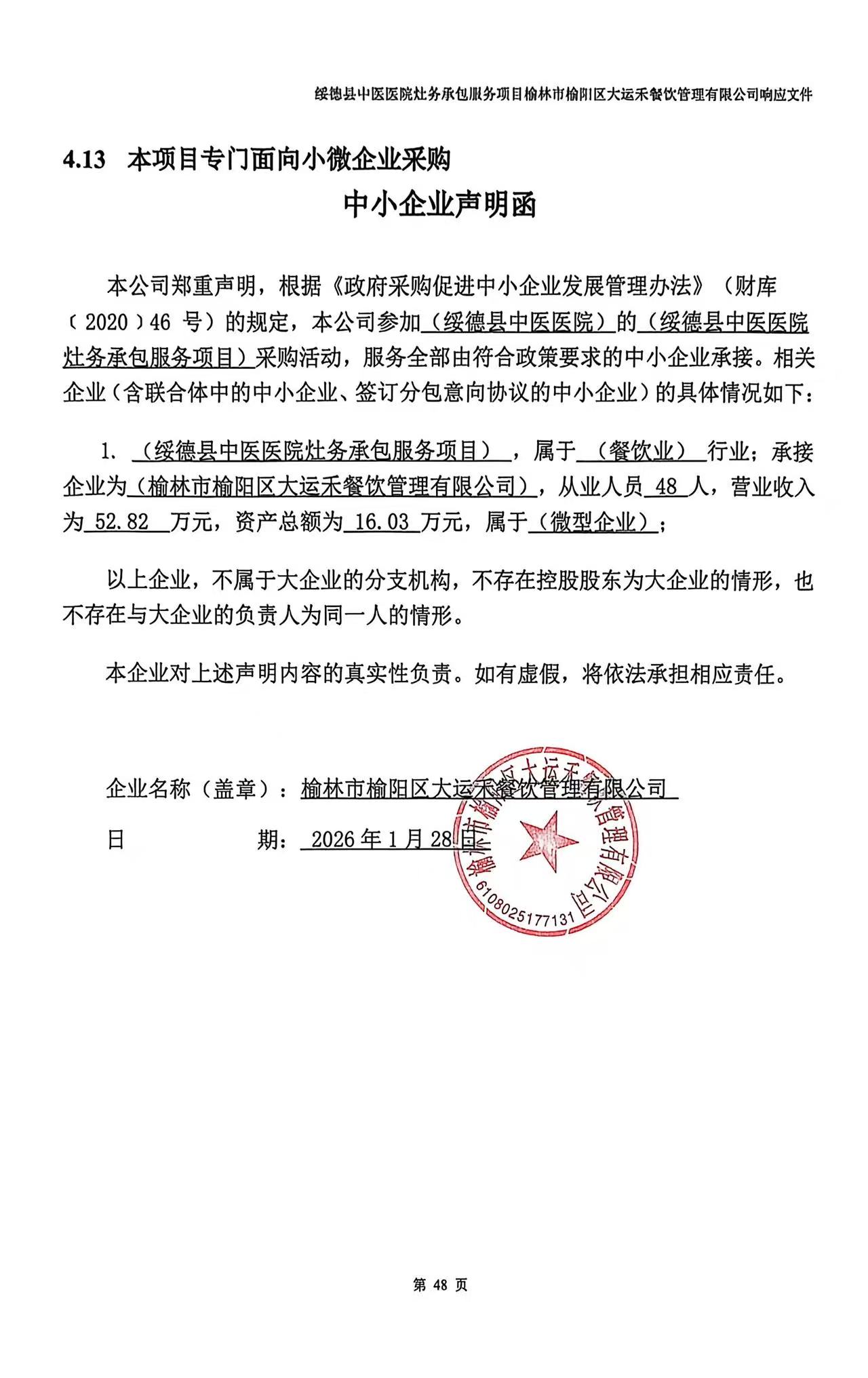 公告概要:| 公告信息: | | 采购项目名称 | 灶务承包服务项目 | | 品目 | | | 采购单位 | 绥德县中医医院 | | 行政区域 | 绥德县 | 公告时间 | 2026年01月29日 16:24 | | 评审专家(单一来源采购人员)名单 | 蒲海伟,李慧艳,王旭东 | | 总成交金额 | ¥47.268000 万元(人民币) | | 联系人及联系方式: | | 项目联系人 | 刘工 | | 项目联系电话 | 0912-5856677 | | 采购单位 | 绥德县中医医院 | | 采购单位地址 | 榆林市绥德县名州镇名州街3号 | | 采购单位联系方式 | 13992241855 | | 代理机构名称 | 陕西中采项目管理有限公司 | | 代理机构地址 | 陕西省榆林市绥德县永乐大道百合家园3号楼3单元301 | | 代理机构联系方式 | 0912-5856677 | | 附件: | | 附件1 | 中小企业声明.jpg | | 附件2 | 绥德县中医医院灶务承包服务项目中标(成交)明细.pdf | | 附件3 | 48招标文件(5).pdf |