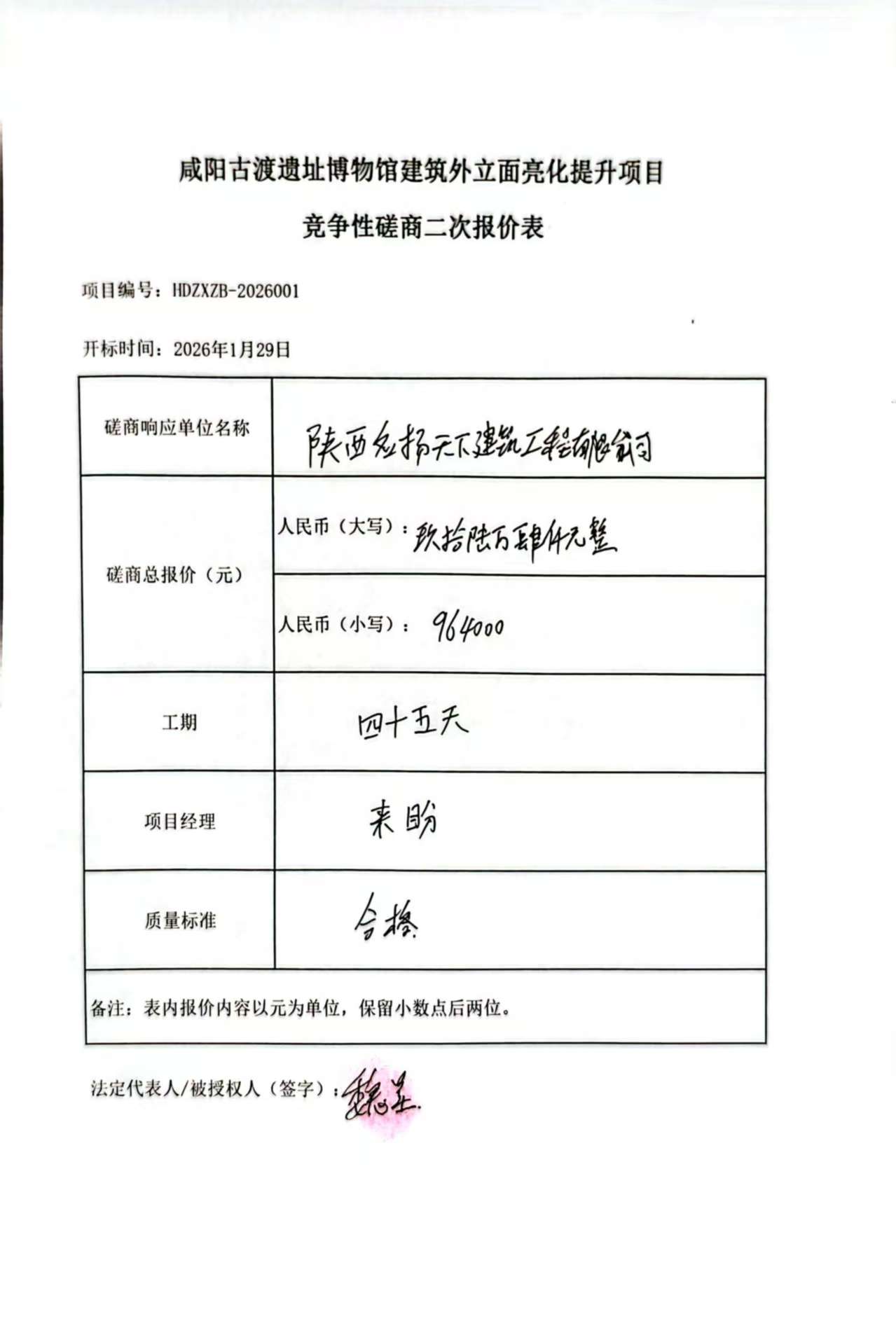一、项目编号:HDZXZB-2026001 二、项目名称:咸阳古渡遗址博物馆建筑外立面亮化提升项目 三、采购结果 采购包1: | 供应商名称 | 供应商地址 | 中标(成交)金额 | 评审总得分 | | 陕西名扬天下建筑工程有限公司 | 陕西省西安市浐灞生态区东三环7188号同泰灯具城C区1排52号 | 964,000.00元 | 92.93 | 四、主要标的信息 合同包1(咸阳古渡遗址博物馆建筑外立面亮化提升项目): 工程类(陕西名扬天下建筑工程有限公司) | 品目号 | 品目名称 | 采购标的 | 施工范围 | 施工工期 | 项目经理 | 执业证书信息 | 金额(元) | | 1 | 建筑物照明设备安装 | 工程 | 详见采购文件 | 四十五天 | 来盼 | 陕261151675854 | 964,000.00 | 五、评审专家(单一来源采购人员)名单: 六、代理服务收费标准及金额: | 代理服务收费标准及金额 | 依据国家计委颁布《招标代理服务收费管理暂行办法》(计价格[2002]1980号)文件的有关规定执行。若代理服务费不足伍仟元按伍仟元收取。 | | 合同包号 | 合同包名称 | 代理服务费金额(万元) | 收取对象 | | 1 | 咸阳古渡遗址博物馆建筑外立面亮化提升项目 | 0.964 | 中标(成交)供应商 | 七、公告期限 自本公告发布之日起1个工作日。 八、其他补充事宜 九、凡对本次公告内容提出询问,请按以下方式联系。 1.采购人信息 名称:咸阳博物院 地址:咸阳市渭城区中山街53号 联系方式:029-33233686 2.采购代理机构信息 名称:华地众信工程项目管理有限公司 地址:陕西省西咸新区空港新城管理委员会F座7楼 联系方式:18182565493 3.项目联系方式 项目联系人:李颖 电话:18182565493 华地众信工程项目管理有限公司 2026年01月30日 |