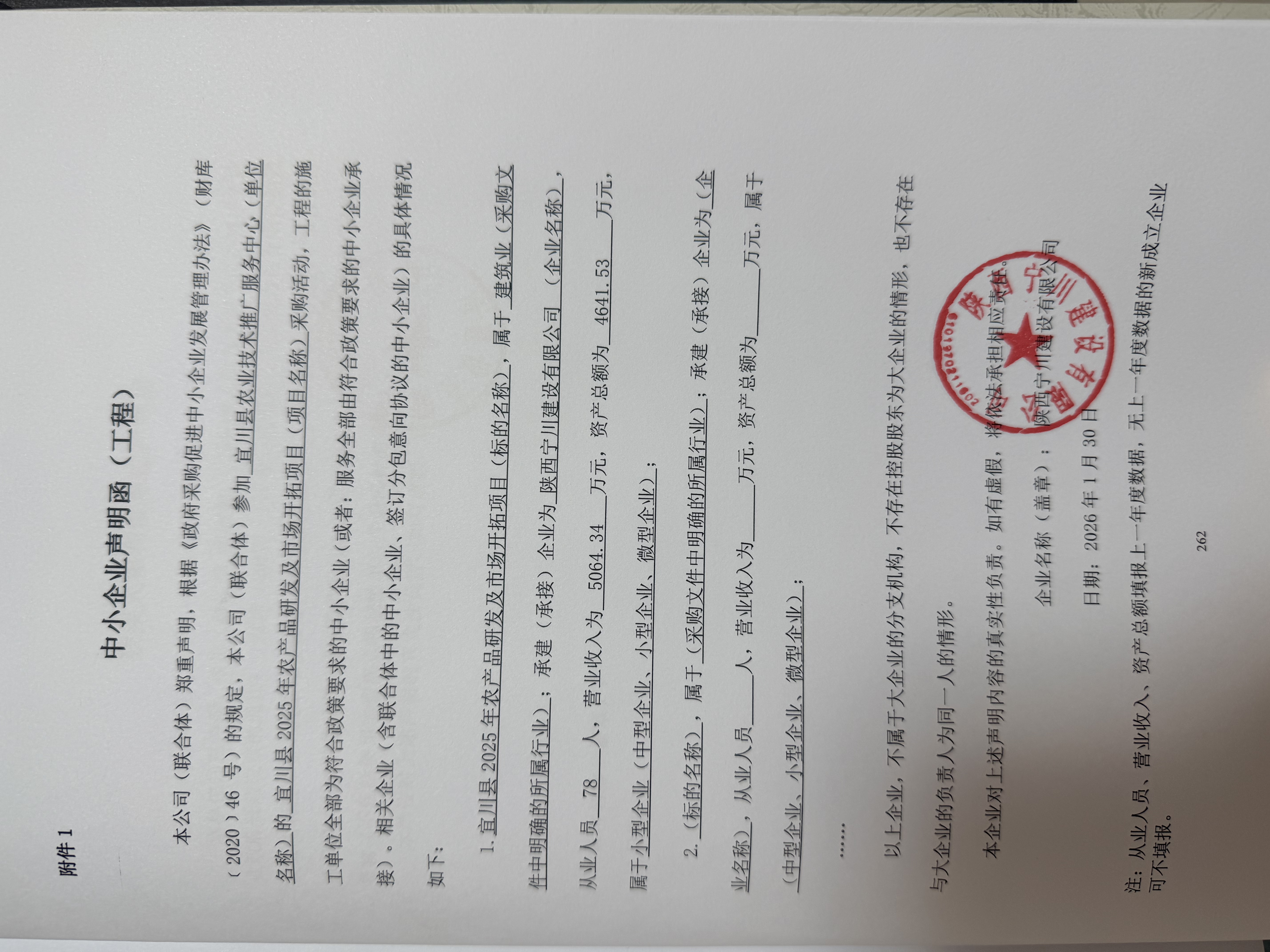 公告概要:| 公告信息: | | 采购项目名称 | 宜川县2025年农产品研发及市场开拓项目 | | 品目 | | | 采购单位 | 宜川县农业技术推广服务中心 | | 行政区域 | 宜川县 | 公告时间 | 2026年01月30日 16:29 | | 评审专家(单一来源采购人员)名单 | 王军,马建荣,付金娥 | | 总成交金额 | ¥39.980000 万元(人民币) | | 联系人及联系方式: | | 项目联系人 | 高工 | | 项目联系电话 | 17309114663 | | 采购单位 | 宜川县农业技术推广服务中心 | | 采购单位地址 | 宜川县党湾街136号 | | 采购单位联系方式 | 15991523906 | | 代理机构名称 | 陕西悦荣项目管理有限公司 | | 代理机构地址 | 延安市新区鲁艺三号苑24号楼1单元1101室 | | 代理机构联系方式 | 17309114663 | | 附件: | | 附件1 | 中小企业声明函.jpg | | 附件2 | 宜川县农业技术推广服务中心宜川县2025年农产品研发及市场开拓项目中标(成交)明细.pdf | | 附件3 | 002 磋商文件.pdf |