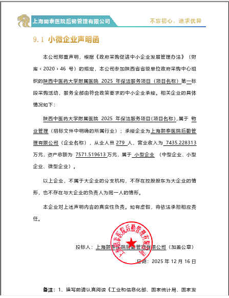 一、项目编号:SNCG-FM-2025189 二、项目名称:2025年保洁服务项目 三、采购结果 采购包1: | 供应商名称 | 供应商地址 | 中标(成交)金额 | 评审总得分 | | 上海朗泰医院后勤管理有限公司 | 上海市奉贤区金钱公路228号2幢434室 | 2,537,000.00元 | 86.80 | 采购包2: | 供应商名称 | 供应商地址 | 中标(成交)金额 | 评审总得分 | | 河南万厦物业管理有限公司 | 郑州市金水区姚砦路133号8号楼1单元3层 | 427,137.60元 | 86.61 | 采购包3: | 供应商名称 | 供应商地址 | 中标(成交)金额 | 评审总得分 | | 陕西百舸物业管理有限公司 | 陕西省西安市曲江新区雁塔南路南郊水厂路7号 | 775,822.49元 | 85.50 | 四、主要标的信息 合同包1(陕西中医药大学附属医院2025年南楼、门诊等区域保洁服务项目): 服务类(上海朗泰医院后勤管理有限公司) | 品目号 | 品目名称 | 采购标的 | 服务范围 | 服务要求 | 服务时间 | 服务标准 | 金额(元) | | 1 | 物业管理服务 | 第一标段(南楼和门诊) | 满足招标文件服务范围 | 满足招标文件服务要求 | 合同签订后1年 | 满足招标文件服务标准 | 2,537,000.00 | 合同包2(陕西中医药大学附属医院2025年家属区保洁服务项目): 服务类(河南万厦物业管理有限公司) | 品目号 | 品目名称 | 采购标的 | 服务范围 | 服务要求 | 服务时间 | 服务标准 | 金额(元) | | 2 | 物业管理服务 | 第二标段(家属区) | 满足招标文件服务范围 | 满足招标文件服务要求 | 合同签订后1年 | 满足招标文件服务标准 | 427,137.60 | 合同包3(陕西中医药大学附属医院2025年工作区外围、嘉惠分院老院区保洁服务项目): 服务类(陕西百舸物业管理有限公司) | 品目号 | 品目名称 | 采购标的 | 服务范围 | 服务要求 | 服务时间 | 服务标准 | 金额(元) | | 3 | 物业管理服务 | 第三标段(工作区外围) | 满足招标文件服务范围 | 满足招标文件服务要求 | 合同签订后1年 | 满足招标文件服务标准 | 775,822.49 | 五、评审专家(单一来源采购人员)名单: 李永清(采购人代表)、符媛、冯申虎、白美娟、宋慧芬 六、代理服务收费标准及金额: | 代理服务收费标准及金额 | | | 合同包号 | 合同包名称 | 代理服务费金额(万元) | 收取对象 | | 1 | 陕西中医药大学附属医院2025年南楼、门诊等区域保洁服务项目 | 0 | 无 | | 2 | 陕西中医药大学附属医院2025年家属区保洁服务项目 | 0 | 无 | | 3 | 陕西中医药大学附属医院2025年工作区外围、嘉惠分院老院区保洁服务项目 | 0 | 无 | 七、公告期限 自本公告发布之日起1个工作日。 八、其他补充事宜 根据财办库〔2023〕243号《关于进一步提高政府采购透明度和采购效率相关事项的通知》公示如下: 第一标段: 上海朗泰医院后勤管理有限公司评审总得分:304.5分;评审平均分:60.90分;最终得分:86.80分 第二标段:河南万厦物业管理有限公司评审总得分:594分;评审平均分:58.80分;最终得分:86.61分 第三标段:陕西百舸物业管理有限公司评审总得分:288.5分;评审平均分:57.70分;最终得分:85.50分 九、凡对本次公告内容提出询问,请按以下方式联系。 1.采购人信息 名称:陕西中医药大学附属医院 地址:陕西省咸阳市渭阳西路副2号 联系方式:029-33320910 2.采购代理机构信息 名称:陕西省省级单位政府采购中心 地址:西安市碑林区长安北路14号 联系方式:029-88661361 3.项目联系方式 项目联系人:杨老师 电话:029-88661361 陕西省省级单位政府采购中心 2026年01月30日 |