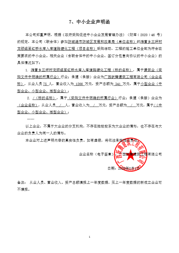 2.废标结果: 四、主要标的信息 工程类主要标的信息: | 序号 | 标项名称 | 标的名称 | 施工范围 | 施工工期 | 项目经理 | 执业证书信息 | | 1 | 滩营乡三坪村龙颈组至红桥水库入库道路硬化工程 | 滩营乡三坪村龙颈组至红桥水库入库道路硬化工程 | 新建道路全长1590m,路面结构层15cm厚级配碎石垫层,180mm厚C25水泥混凝土路面。新建混凝1-φ0.5钢筋砼管涵、1-φ0.3钢筋砼管涵、2-5*2.2m钢筋混凝土盖板涵、禁令标志+警告标志(○600+△700)、涵洞警示桩及项目竣工标牌等;具体详见施工图纸及工程量清单。 | 120日历天 | 黄艳诗 | 桂245121436516 | 五、评审专家(单一来源采购人员)名单: 郑淇升,李培铭(第1分标采购人代表),黄钟乐 六、代理服务收费标准及金额: 1.代理服务收费标准:按采购文件规定的收费计算标准(工程类)采用差额定率累进法计算出收费基准价格,由成交人在领取成交通知书时一次性向采购代理机构支付。 2.代理服务收费金额(元):11150 七、公告期限 自本公告发布之日起1个工作日。 八、其他补充事宜 1.供应商认为成交结果使自己的权益受到损害的,可以在知道或者应知其权益受到损害之日起7个工作日内,以书面形式向采购人/采购代理机构提出质疑。 2.网上查询地址:中国政府采购网、广西壮族自治区政府采购网、广西防城港防城区人民政府门户网站、全国公共资源交易平台(广西·防城港)。 3.成交供应商评审总得分:88.55。 4.监督部门:防城港市防城区政府采购中心;电话:0770-2213681。 九、对本次公告内容提出询问,请按以下方式联系 1.采购人信息 名 称:防城港市防城区发展和改革局 地 址:防城港市防城区防北路112号 联系方式:0770-2035236 2.采购代理机构信息 名 称:广西千豪建设项目管理有限公司 地 址:防城港市防城区城头二巷140号 联系方式:0770-3252398 3.项目联系方式 项目联系人:苏琳钧 电 话:0770-3252398 附件信息: |