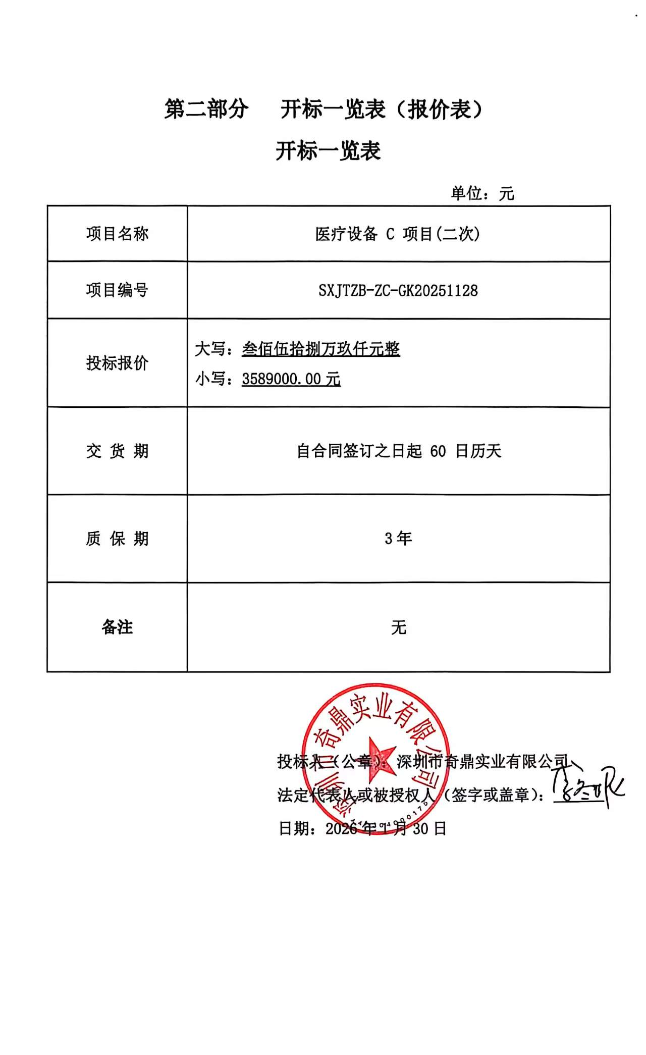 一、项目编号:SXJTZB-ZC-GK20251128 二、项目名称:医疗设备C项目(二次) 三、采购结果 采购包1: | 供应商名称 | 供应商地址 | 中标(成交)金额 | 评审总得分 | | 深圳市奇鼎实业有限公司 | 深圳市福田区福保街道新港社区新洲南路2008号新都市商业广场一层C栋C106 | 3,589,000.00元 | 85.24 | 四、主要标的信息 合同包1(高清电子胃肠镜系统): 货物类(深圳市奇鼎实业有限公司) | 品目号 | 品目名称 | 采购标的 | 品牌 | 规格型号 | 数量(单位) | 单价(元) | 总价(元) | | 1 | 医用内窥镜 | 高清电子胃肠镜系统 | 富士胶片(详见分项报价表) | VP-7000(其他详见分项报价表) | 1.00(批) | 3,589,000.00 | 3,589,000.00 | 五、评审专家(单一来源采购人员)名单: 六、代理服务收费标准及金额: | 代理服务收费标准及金额 | 参照国家计委印发的《招标代理服务收费管理暂行办法》的通知(计价格〔2002〕1980 号)的标准下浮 10%收取。 | | 合同包号 | 合同包名称 | 代理服务费金额(万元) | 收取对象 | | 1 | 高清电子胃肠镜系统 | 3.9131 | 中标(成交)供应商 | 七、公告期限 自本公告发布之日起1个工作日。 八、其他补充事宜 九、凡对本次公告内容提出询问,请按以下方式联系。 1.采购人信息 名称:宝鸡市中医医院 地址:宝鸡市金台区行政大道58号 联系方式:0917-3886051 2.采购代理机构信息 名称:陕西嘉唐建设项目管理有限公司 地址:西安市未央区凤城五路与明光路十字天朗经开中心10楼11002室 联系方式:029-89351397 3.项目联系方式 项目联系人:张荷、贾婵、段冬梅、王琳娜、曾小旦 电话:029-89351397 陕西嘉唐建设项目管理有限公司 2026年02月02日 |