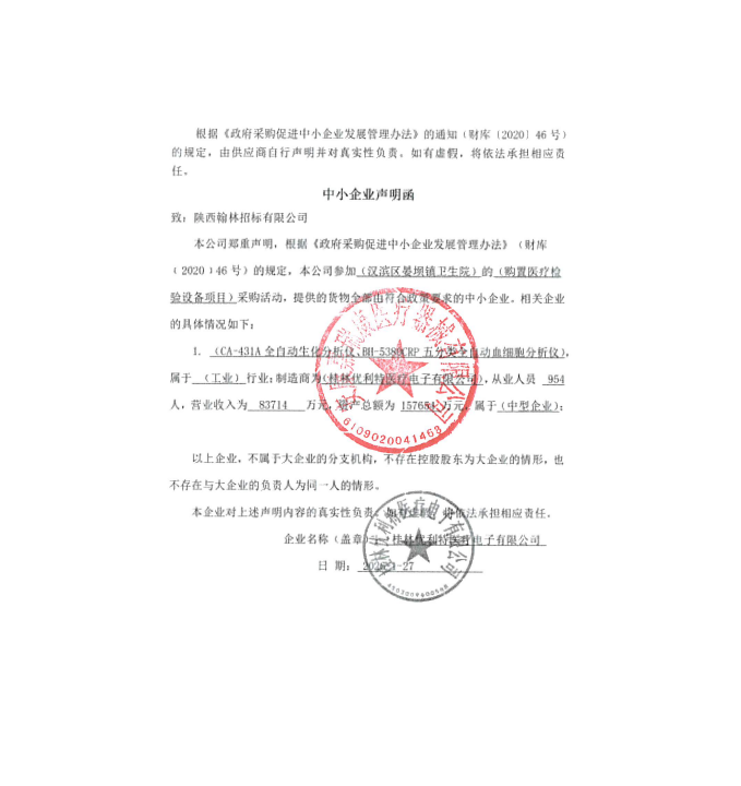 公告概要:| 公告信息: | | 采购项目名称 | 购置医疗检验设备项目 | | 品目 | | | 采购单位 | 汉滨区晏坝镇卫生院 | | 行政区域 | 汉滨区 | 公告时间 | 2026年02月02日 16:54 | | 评审专家(单一来源采购人员)名单 | 陈治崇,李运琪,孙建军 | | 总成交金额 | ¥24.580000 万元(人民币) | | 联系人及联系方式: | | 项目联系人 | 刘工 | | 项目联系电话 | 029-89640570 | | 采购单位 | 汉滨区晏坝镇卫生院 | | 采购单位地址 | 汉滨区晏坝镇 | | 采购单位联系方式 | 0915-3090053 | | 代理机构名称 | 陕西翰林招标有限公司 | | 代理机构地址 | 西安市雁塔区高新路西部国际广场B座28层 | | 代理机构联系方式 | 029-89640570 | | 附件: | | 附件1 | 汉滨区晏坝镇卫生院购置医疗检验设备项目中标(成交)明细.pdf | | 附件2 | 分项报价表.png | | 附件3 | 中小企业声明函.png | | 附件4 | 购置医疗检验设备项目.pdf |
