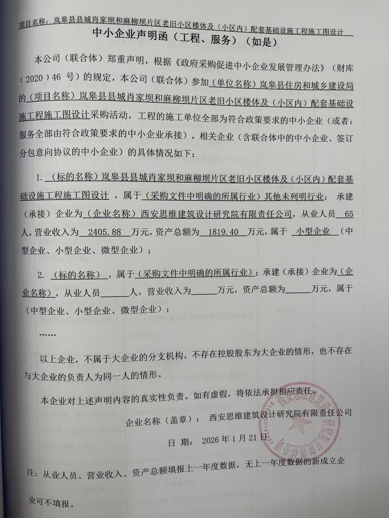 一、项目编号:AKSH2026-ZCS-004 二、项目名称:岚皋县县城肖家坝和麻柳坝片区老旧小区楼体及(小区内)配套基础设施工程施工图设计 三、采购结果 采购包1: | 供应商名称 | 供应商地址 | 中标(成交)金额 | 评审总得分 | | 西安思维建筑设计研究院有限责任公司 | 陕西省西安市雁塔区太白南路216号嘉天国际A座9层 | 250,000.00元 | 86.17 | 四、主要标的信息 合同包1(岚皋县县城肖家坝和麻柳坝片区老旧小区楼体及(小区内)配套基础设施工程施工图设计): 服务类(西安思维建筑设计研究院有限责任公司) | 品目号 | 品目名称 | 采购标的 | 服务范围 | 服务要求 | 服务时间 | 服务标准 | 金额(元) | | 1 | 工程设计服务 | 工程设计服务 | 本项目采购文件约定的工程规模范围内的全部施工图设计 | 设计成果须符合国家、行业及地方现行规范标准,确保通过施工图审查机构审查及相关主管部门备案 | 合同签订后且甲方提交相关资料后20个工作日内,乙方提交施工图设计文件 | 国家及地方现行有关设计规范、规定、标准等 | 250,000.00 | 五、评审专家(单一来源采购人员)名单: 六、代理服务收费标准及金额: | 代理服务收费标准及金额 | 参照国家计委关于印发《招标代理服务收费管理暂行办法》的通知(计价格[2002]1980号)和《国家发展改革委办公厅关于招标代理服务收费有关问题的通知》(发改办价格[2003]857号)规定标准计取。 | | 合同包号 | 合同包名称 | 代理服务费金额(万元) | 收取对象 | | 1 | 岚皋县县城肖家坝和麻柳坝片区老旧小区楼体及(小区内)配套基础设施工程施工图设计 | 0.29 | 中标(成交)供应商 | 七、公告期限 自本公告发布之日起1个工作日。 八、其他补充事宜 九、凡对本次公告内容提出询问,请按以下方式联系。 1.采购人信息 名称:岚皋县住房和城乡建设局 地址:岚皋县城关镇河滨大道17号 联系方式:0915-2526531 2.采购代理机构信息 名称:安康尚昊招标代理有限公司 地址:安康市高新区高新观澜8栋2单元801室 联系方式:13991519725 3.项目联系方式 项目联系人:郑工 电话:13991519725 安康尚昊招标代理有限公司 2026年02月02日 |