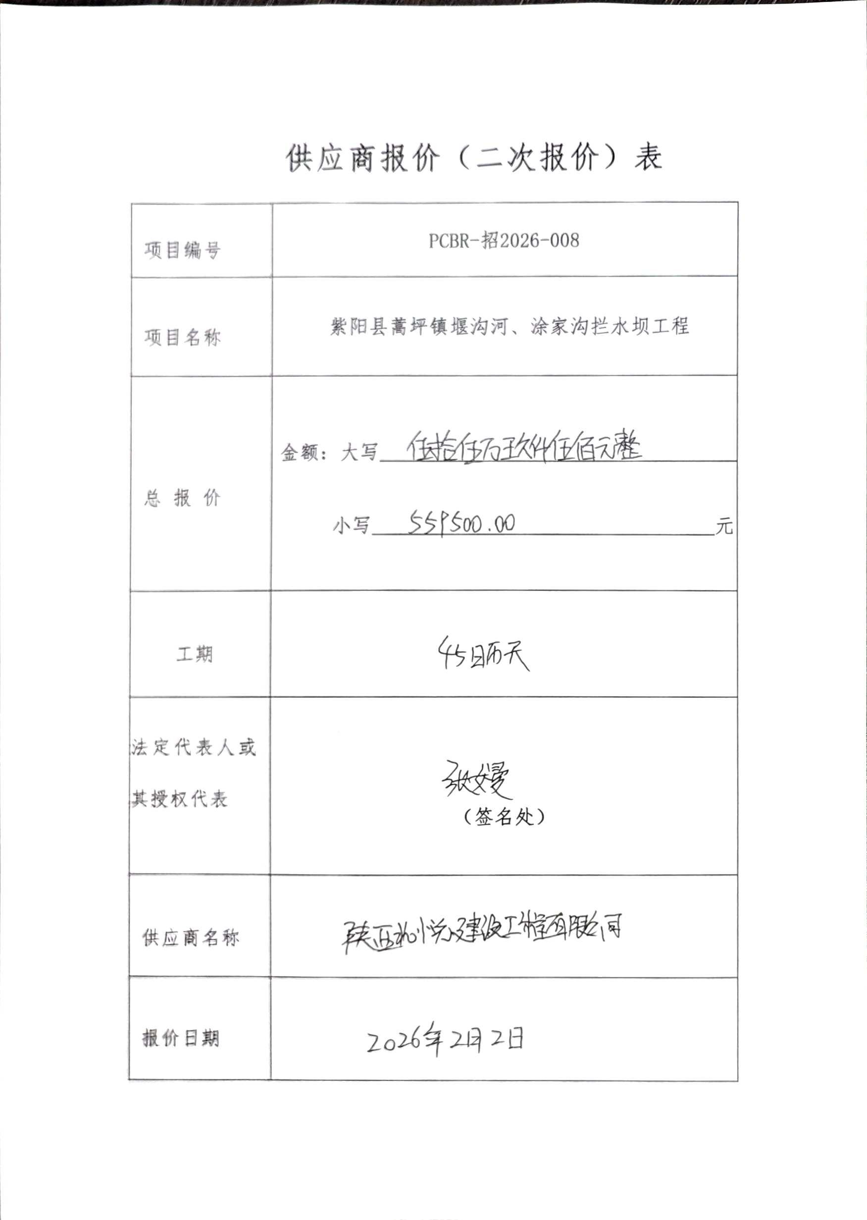 一、项目编号:PCBR-招2026-008 二、项目名称:紫阳县蒿坪镇堰沟河、涂家沟拦水坝工程 三、采购结果 采购包1: | 供应商名称 | 供应商地址 | 中标(成交)金额 | 评审总得分 | | 陕西北悦建设工程有限公司 | 陕西省安康市汉滨区南环路东海尚府一单元2303 | 559,500.00元 | 88.67 | 四、主要标的信息 合同包1(紫阳县蒿坪镇堰沟河、涂家沟拦水坝工程): 工程类(陕西北悦建设工程有限公司) | 品目号 | 品目名称 | 采购标的 | 施工范围 | 施工工期 | 项目经理 | 执业证书信息 | 金额(元) | | 1 | 其他水利工程施工 | 新建潜坝15座 河道袒护1处 | 图纸及工程量清单所包含的全部内容 | 45日历天 | 王小宁 | 陕261242408782 | 559,500.00 | 五、评审专家(单一来源采购人员)名单: 六、代理服务收费标准及金额: | 代理服务收费标准及金额 | 参照国家计委关于印发《招标代理服务收费管理暂行办法》的通知(计价格〔2002〕1980号)、《国家发展和改革委员会办公厅关于招标代理服务收费有关问题的通知》(发改办价格〔2003〕857号)规定 | | 合同包号 | 合同包名称 | 代理服务费金额(万元) | 收取对象 | | 1 | 紫阳县蒿坪镇堰沟河、涂家沟拦水坝工程 | 0.5595 | 中标(成交)供应商 | 七、公告期限 自本公告发布之日起1个工作日。 八、其他补充事宜 九、凡对本次公告内容提出询问,请按以下方式联系。 1.采购人信息 名称:紫阳县蒿坪镇人民政府 地址:陕西省紫阳县蒿坪镇上街 联系方式:18429057431 2.采购代理机构信息 名称:陕西磐创佰瑞项目管理有限公司 地址:陕西省安康市汉滨区城投公园中央16号楼2603室 联系方式:18992541315 3.项目联系方式 项目联系人:裴建东 电话:18992541315 陕西磐创佰瑞项目管理有限公司 2026年02月03日 |