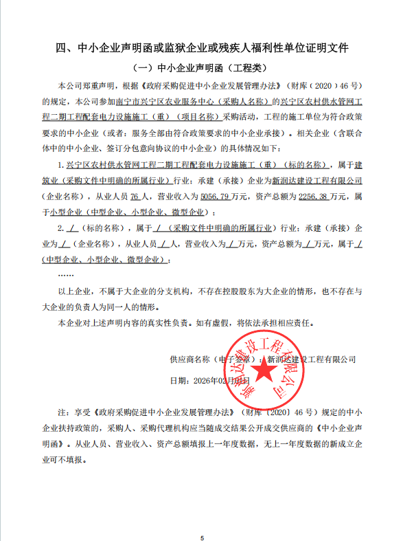一、项目编号:NNZC2026-C2-020004-ZQZB 二、项目名称:兴宁区农村供水管网工程二期工程配套电力设施施工(重) 三、中标(成交)信息 1.中标结果: | 序号 | 中标(成交)金额(元) | 中标供应商名称 | 中标供应商地址 | | 1 | 报价:1424096.06(元) | 新润达建设工程有限公司 | 南宁市创新西路17号食品仓库 |