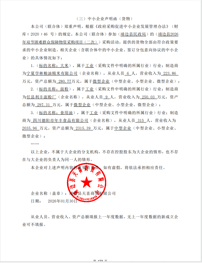 四、主要标的信息合同包1(靖边县2026年双节困难群众保障物资采购项目): 货物类(靖边县天喜商贸有限公司)
