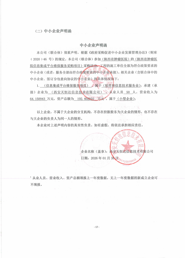 公告概要:| 公告信息: | | 采购项目名称 | 信息集成平台维保服务采购项目 | | 品目 | | | 采购单位 | 陕西省肿瘤医院 | | 行政区域 | 陕西省 | 公告时间 | 2026年02月03日 18:39 | | 评审专家(单一来源采购人员)名单 | 姚昀,李茉,陈涛 | | 总成交金额 | ¥13.000000 万元(人民币) | | 联系人及联系方式: | | 项目联系人 | 代光艳、刘如拉、贾亚妮 | | 项目联系电话 | 029-89581863、15229797656 | | 采购单位 | 陕西省肿瘤医院 | | 采购单位地址 | 西安市雁塔西路309号 | | 采购单位联系方式 | 029-85276353 | | 代理机构名称 | 开瑞项目管理有限公司 | | 代理机构地址 | 陕西省西安市莲湖区高新二路1号招商银行大厦19层 | | 代理机构联系方式 | 029-89581863 | | 附件: | | 附件1 | 定稿-陕西省肿瘤医院信息集成平台维保服务采购项目.pdf | | 附件2 | 陕西省肿瘤医院信息集成平台维保服务采购项目中标(成交)明细.pdf | | 附件3 | 中小企业声明函.png |