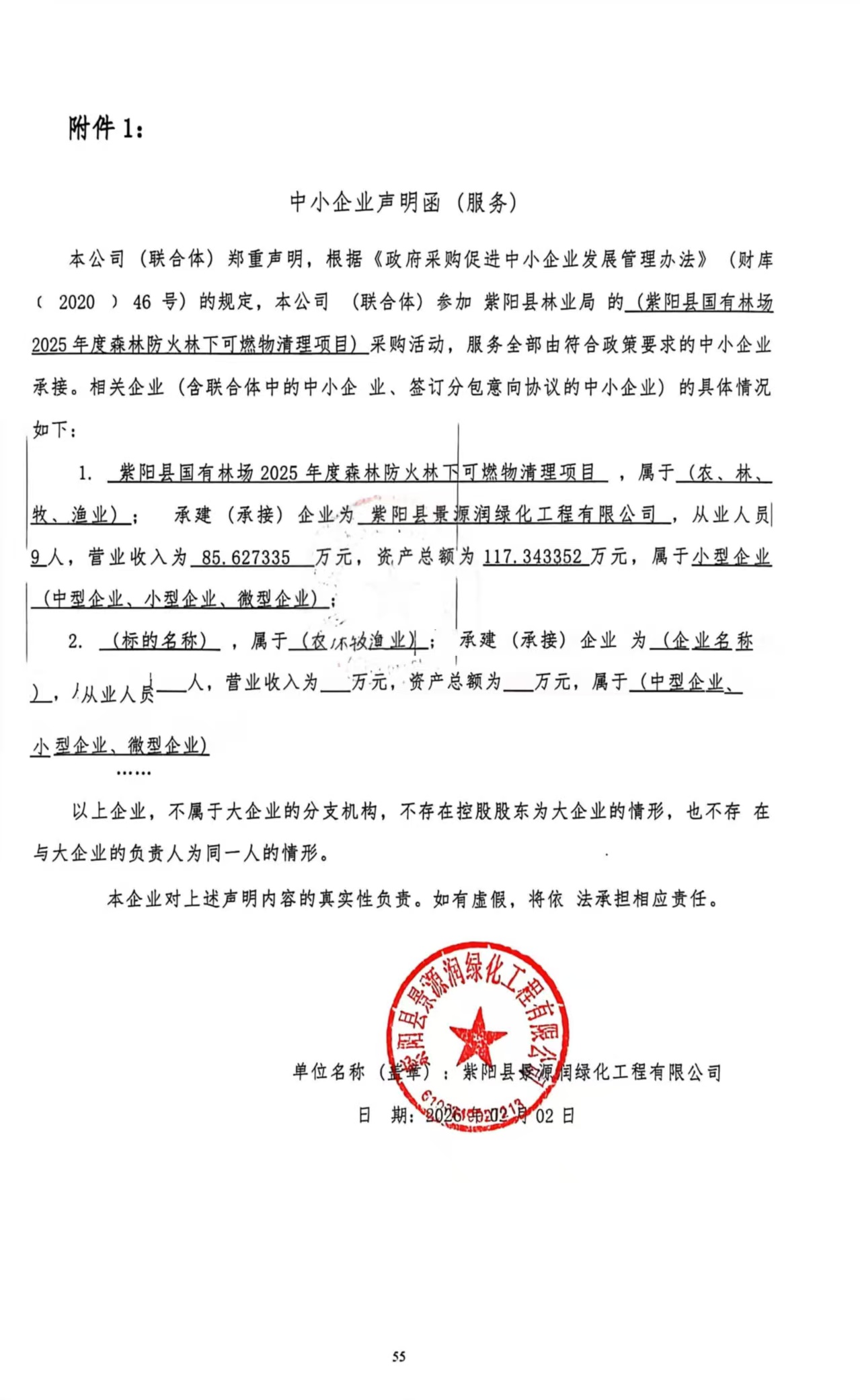 一、项目编号:LTZB2026-CS1001 二、项目名称:紫阳县国有林场2025年度森林防火林下可燃物清理项目 三、采购结果 采购包1: | 供应商名称 | 供应商地址 | 中标(成交)金额 | 评审总得分 | | 紫阳县景源润绿化工程有限公司 | 陕西省安康市紫阳县城关镇河堤路街道社区紫邑新城5号楼604室 | 297,800.00元 | 89.48 | 四、主要标的信息 合同包1(紫阳县国有林场2025年度森林防火林下可燃物清理项目): 服务类(紫阳县景源润绿化工程有限公司) | 品目号 | 品目名称 | 采购标的 | 服务范围 | 服务要求 | 服务时间 | 服务标准 | 金额(元) | | 1 | 其他林业服务 | 紫阳县汉王镇安五村擂鼓台国有林区570亩和瓦庙老庄村国有林区340亩的林下可燃物清理 | 详见磋商响应文件 | 详见磋商响应文件 | 合同签订后60日内完成 | 详见磋商响应文件 | 297,800.00 | 五、评审专家(单一来源采购人员)名单: 六、代理服务收费标准及金额: | 代理服务收费标准及金额 | 参照国家计委颁布《招标代理服务收费管理暂行办法》(计价格[2002]1980号)和国家发展和改革委员会办公厅颁发的《关于招标代理服务收费有关问题的通知》(发改办价格[2003]857号)文件规定执行。 | | 合同包号 | 合同包名称 | 代理服务费金额(万元) | 收取对象 | | 1 | 紫阳县国有林场2025年度森林防火林下可燃物清理项目 | 0.4467 | 中标(成交)供应商 | 七、公告期限 自本公告发布之日起1个工作日。 八、其他补充事宜 九、凡对本次公告内容提出询问,请按以下方式联系。 1.采购人信息 名称:紫阳县林业局 地址:紫阳县城关镇西关广场坎下林业局办公楼 联系方式:15191550903 2.采购代理机构信息 名称:陕西力天永信项目管理有限公司 地址:陕西省西安市高新区丈八四路六号缤纷南郡11-1-304 联系方式:15114957811 3.项目联系方式 项目联系人:李东英 电话:15114957811 陕西力天永信项目管理有限公司 2026年02月03日 |