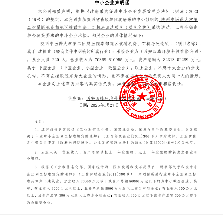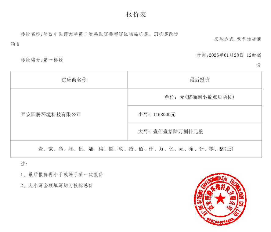 四、主要标的信息合同包1(陕西中医药大学第二附属医院秦都院区核磁机房、CT机房改造项目): 工程类(西安四腾环境科技有限公司)