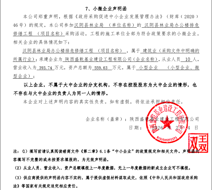 公告概要:| 公告信息: | | 采购项目名称 | 办公楼排危修缮工程 | | 品目 | | | 采购单位 | 汉阴县林业局 | | 行政区域 | 汉阴县 | 公告时间 | 2026年02月05日 12:03 | | 评审专家(单一来源采购人员)名单 | 祝小康,胡强,谢全侠 | | 总成交金额 | ¥66.985000 万元(人民币) | | 联系人及联系方式: | | 项目联系人 | 龙先生 | | 项目联系电话 | 0915-5273535 | | 采购单位 | 汉阴县林业局 | | 采购单位地址 | 汉阴县城关镇凤凰大道 | | 采购单位联系方式 | 0915-2297308 | | 代理机构名称 | 汉阴县政府采购中心 | | 代理机构地址 | 汉阴县城南凤凰大道财政局3楼 | | 代理机构联系方式 | 0915-5273535 | | 附件: | | 附件1 | 汉阴县林业局办公楼排危修缮工程中标(成交)明细.pdf | | 附件2 | 中小企业声明函.png | | 附件3 | 林业局办公楼排危修缮工程磋商文件.pdf |