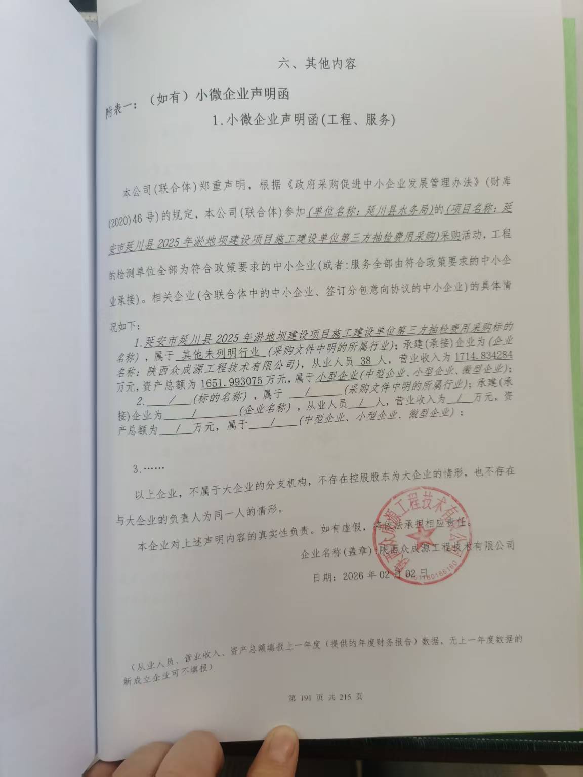公告概要:| 公告信息: | | 采购项目名称 | 延安市延川县2025年淤地坝建设项目施工建设单位第三方抽检费用采购 | | 品目 | | | 采购单位 | 延川县水务局 | | 行政区域 | 延川县 | 公告时间 | 2026年02月05日 10:13 | | 评审专家(单一来源采购人员)名单 | 任永胜,董亮,许永江 | | 总成交金额 | ¥14.605000 万元(人民币) | | 联系人及联系方式: | | 项目联系人 | 孙工 | | 项目联系电话 | 0911-8331529 | | 采购单位 | 延川县水务局 | | 采购单位地址 | 延安市延川县 | | 采购单位联系方式 | 13772291951 | | 代理机构名称 | 延川县政府采购中心 | | 代理机构地址 | 陕西省延安市延川县延川县河东财政办公大楼(延川县财政局1楼) | | 代理机构联系方式 | 0911-8331531 | | 附件: | | 附件1 | 延川县水务局延安市延川县2025年淤地坝建设项目施工建设单位第三方抽检费用采购中标(成交)明细.pdf | | 附件2 | 中小企业声明函.jpg | | 附件3 | 磋商文件.docx |
