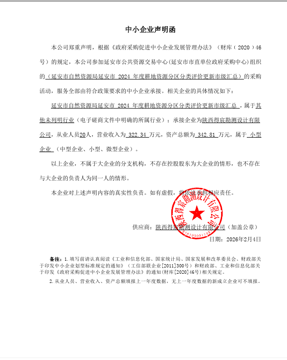 公告概要:| 公告信息: | | 采购项目名称 | 延安市2024年度耕地资源分区分类评价更新市级汇总 | | 品目 | | | 采购单位 | 延安市自然资源局 | | 行政区域 | 延安市 | 公告时间 | 2026年02月05日 16:47 | | 评审专家(单一来源采购人员)名单 | 李嘉琪,李平,翟元喜 | | 总成交金额 | ¥35.500000 万元(人民币) | | 联系人及联系方式: | | 项目联系人 | 高女士 | | 项目联系电话 | 0911-7092221 | | 采购单位 | 延安市自然资源局 | | 采购单位地址 | 为民服务中心综合楼 | | 采购单位联系方式 | 0911-7090412 | | 代理机构名称 | 延安市公共资源交易中心(延安市市直单位政府采购中心) | | 代理机构地址 | 陕西省延安市宝塔区延安市新区为民服务中心南区东楼(7号楼)A2楼 | | 代理机构联系方式 | 0911-7092224 | | 附件: | | 附件1 | 中小企业声明函.png | | 附件2 | 延安市自然资源局延安市2024年度耕地资源分区分类评价更新市级汇总中标(成交)明细.pdf |