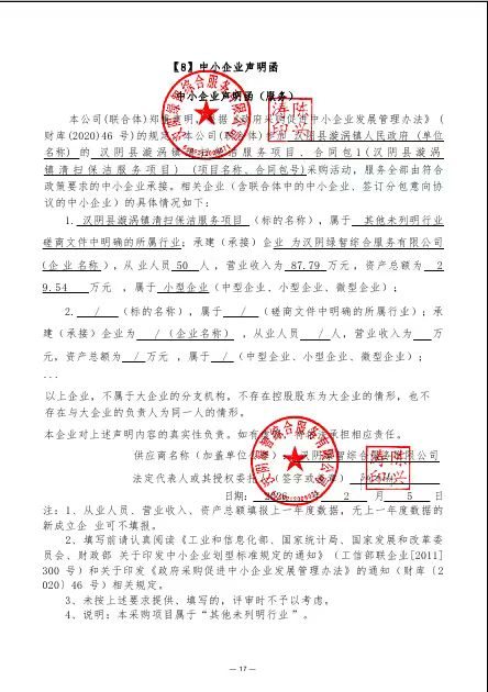 公告概要:| 公告信息: | | 采购项目名称 | 漩涡镇清扫保洁服务项目 | | 品目 | | | 采购单位 | 汉阴县漩涡镇人民政府 | | 行政区域 | 汉阴县 | 公告时间 | 2026年02月06日 16:00 | | 评审专家(单一来源采购人员)名单 | 杨鹏,杜小花,汪东安 | | 总成交金额 | ¥75.800000 万元(人民币) | | 联系人及联系方式: | | 项目联系人 | 文杰 | | 项目联系电话 | 17691259395 | | 采购单位 | 汉阴县漩涡镇人民政府 | | 采购单位地址 | 陕西省安康市汉阴县漩涡镇中街 | | 采购单位联系方式 | 0915-5580212 | | 代理机构名称 | 陕西坤瑞锦塬项目管理咨询有限公司 | | 代理机构地址 | 陕西省安康市高新技术产业开发区汉江路7号缇香郡G2-1301室 | | 代理机构联系方式 | 0915-3366528 | | 附件: | | 附件1 | 汉阴县漩涡镇人民政府漩涡镇清扫保洁服务项目中标(成交)明细.pdf | | 附件2 | 中小企业声明函.jpg |