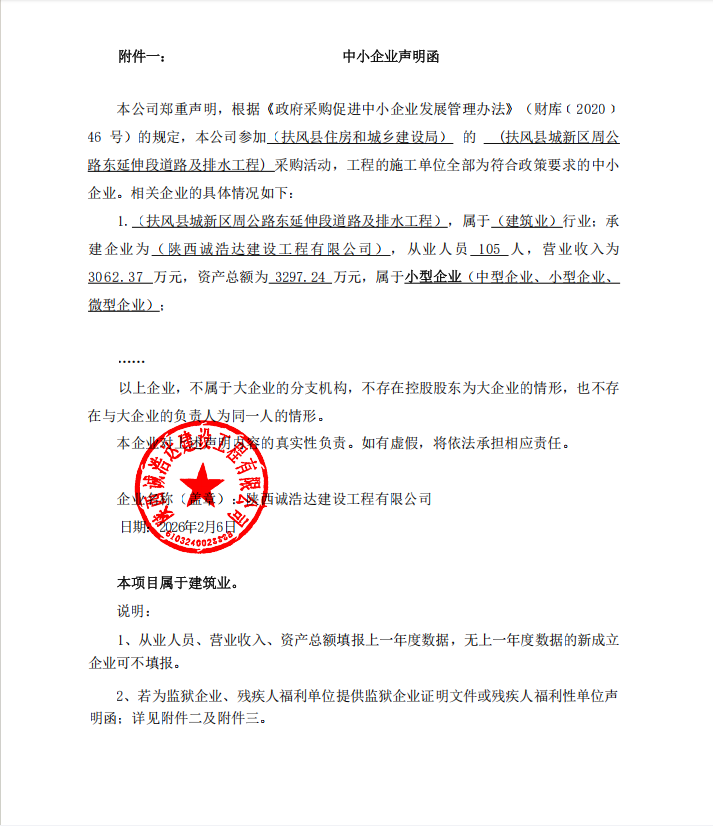 一、项目编号:TWZB2026-001 二、项目名称:扶风县城新区周公路东延伸段道路及排水工程 三、采购结果 采购包1: | 供应商名称 | 供应商地址 | 中标(成交)金额 | 评审总得分 | | 陕西诚浩达建设工程有限公司 | | 2,069,682.30元 | 90.60 | 四、主要标的信息 合同包1(扶风县城新区周公路东延伸段道路及排水工程): 工程类(陕西诚浩达建设工程有限公司) | 品目号 | 品目名称 | 采购标的 | 施工范围 | 施工工期 | 项目经理 | 执业证书信息 | 金额(元) | | 1 | 城市道路工程施工 | 扶风县城新区周公路东延伸段道路及排水工程 | 满足磋商文件要求 | 180个日历日 | 袁超 | 陕261212248098 | 2,069,682.30 | 五、评审专家(单一来源采购人员)名单: 六、代理服务收费标准及金额: | 代理服务收费标准及金额 | 参照《国家计委关于印发<招标代理服务收费管理暂行办法>的通知》(计价格[2002]1980号)和国家发改委办公厅颁发的《关于招标代理服务收费有关问题的通知》(发改办价格【2003】857号)的有关规定按标准下浮20%收取。 | | 合同包号 | 合同包名称 | 代理服务费金额(万元) | 收取对象 | | 1 | 扶风县城新区周公路东延伸段道路及排水工程 | 1.399 | 中标(成交)供应商 | 七、公告期限 自本公告发布之日起1个工作日。 八、其他补充事宜 九、凡对本次公告内容提出询问,请按以下方式联系。 1.采购人信息 名称:扶风县住房和城乡建设局 地址:扶风县城新区西一路 联系方式:0917-5213781 2.采购代理机构信息 名称:陕西天沃工程项目管理有限公司 地址:西安市经济开发区凤城十一路与文景路十字西北角文景广场C座1202室 联系方式:029-68539602 3.项目联系方式 项目联系人:闫工 电话:029-68539602 陕西天沃工程项目管理有限公司 2026年02月09日 |