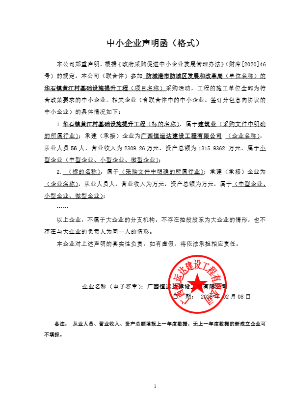 2.废标结果: 四、主要标的信息 工程类主要标的信息: | 序号 | 标项名称 | 标的名称 | 施工范围 | 施工工期 | 项目经理 | 执业证书信息 | | 1 | 华石镇黄江村基础设施提升工程 | 华石镇黄江村基础设施提升工程 | 新建道路全长1195m,宽度3.0m。路面结构层15cm厚级配碎石垫层,180mm厚C25水泥混凝土路面。新建现浇混凝土C25排水沟、C20片石混凝土挡土墙、太阳能路灯及项目竣工标牌等;具体详见施工图纸及工程量清单。 | 120日历天 | 肖卡 | 桂245121227542 | 五、评审专家(单一来源采购人员)名单: 李培铭,卢远艺,苏兴旺(第1分标采购人代表) 六、代理服务收费标准及金额: 1.代理服务收费标准:以成交金额为计费额,按磋商文件规定的收费计算标准(工程类)采用差额定率累进法计算出收费基准价格,代理服务收费以收费基准价格收取,由成交人在领取成交通知书时一次性向采购代理机构支付。 2.代理服务收费金额(元):6620 七、公告期限 自本公告发布之日起1个工作日。 八、其他补充事宜 1.供应商认为成交结果使自己的权益受到损害的,可以在知道或者应知其权益受到损害之日起7个工作日内,以书面形式向采购人/采购代理机构提出质疑。 2.网上查询地址:中国政府采购网、广西壮族自治区政府采购网、广西防城港防城区人民政府门户网站、全国公共资源交易平台(广西·防城港)。 3.成交供应商评审总得分:84.82。 4.监督部门:防城港市防城区政府采购中心;电话:0770-2213681。 九、对本次公告内容提出询问,请按以下方式联系 1.采购人信息 名 称:防城港市防城区发展和改革局 地 址:防城港市防城区防北路112号 联系方式:0770-2035236 2.采购代理机构信息 名 称:广西成文招标代理有限公司 地 址:防城港市防城区防邕路58-4号(旧法院大门口旁边)3楼 联系方式:0770-3270649 3.项目联系方式 项目联系人:蒋少锦 电 话:0770-3270649 附件信息: |