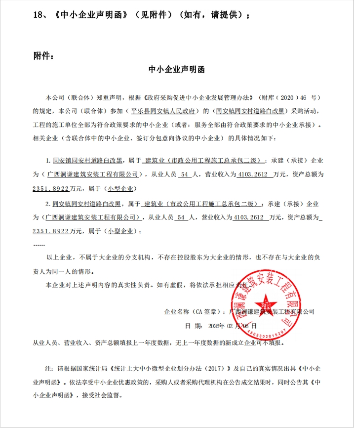 一、项目编号:GLZC2026-C2-300006-GXCH 二、项目名称:同安镇同安村道路白改黑 三、中标(成交)信息 1.中标结果: | 序号 | 中标(成交)金额(元) | 中标供应商名称 | 中标供应商地址 | | 1 | 报价:715880.55(元) | 广西澜谦建筑安装工程有限公司 | 平乐镇同乐新区科赛江景城B1栋1层21号 |