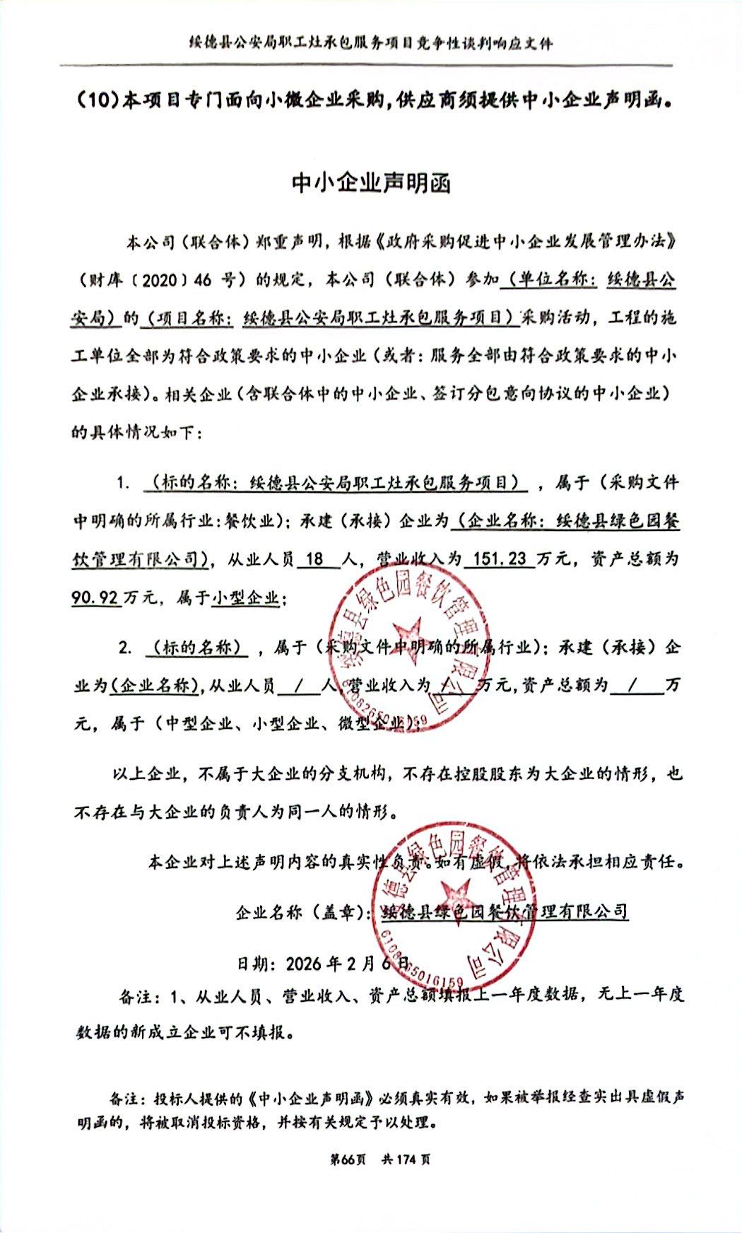 公告概要:| 公告信息: | | 采购项目名称 | 职工灶承包服务项目 | | 品目 | | | 采购单位 | 绥德县公安局 | | 行政区域 | 绥德县 | 公告时间 | 2026年02月09日 09:39 | | 评审专家(单一来源采购人员)名单 | 张向荣,崔孝利,李丽 | | 总成交金额 | ¥47.900000 万元(人民币) | | 联系人及联系方式: | | 项目联系人 | 周工 | | 项目联系电话 | 15891170345 | | 采购单位 | 绥德县公安局 | | 采购单位地址 | 榆林市绥德县名州镇上郡5路 | | 采购单位联系方式 | 13992240987 | | 代理机构名称 | 陕西鑫雅立德工程管理有限公司 | | 代理机构地址 | 陕西省榆林市榆阳区榆林市市民大厦对面(榆溪雅园北门2号商铺-智博财务内) | | 代理机构联系方式 | 15891170345 | | 附件: | | 附件1 | 绥德县公安局职工灶承包服务项目中标(成交)明细.pdf | | 附件2 | 002竞争性谈判终稿48.9万.pdf | | 附件3 | 二次报价表.jpg | | 附件4 | 中小企业声明函.jpg |