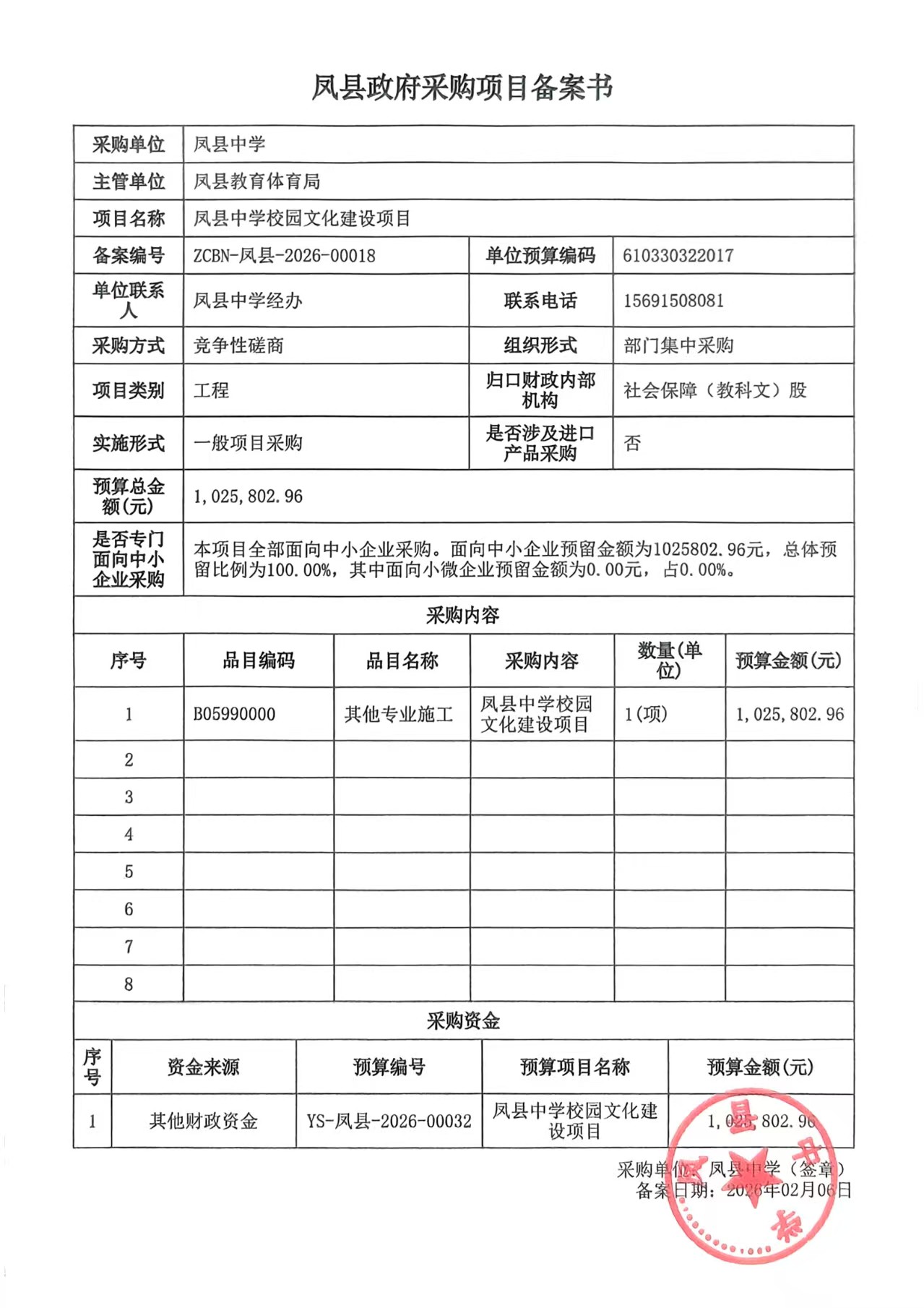 本合同包不接受联合体投标 合同履行期限:具体服务起止日期可随合同签订时间相应顺延 二、申请人的资格要求:1.满足《中华人民共和国政府采购法》第二十二条规定; 2.落实政府采购政策需满足的资格要求: 合同包1(凤县中学校园文化建设项目)落实政府采购政策需满足的资格要求如下: (1)《政府采购促进中小企业发展管理办法》(财库〔2020〕46号)、《财政部关于进一步加大政府采购支持中小企业力度的通知》(财库〔2022〕19号); 3.本项目的特定资格要求: 合同包1(凤县中学校园文化建设项目)特定资格要求如下: 1.供应商应为具有独立承担民事责任的能力且具备向采购人提供相关货物和服务的企业法人、事业单位法人、其他组织或者自然人。企业法人应提供具有统一社会信用代码的营业执照;事业单位法人应提供事业单位法人证等证明文件;其他组织或者自然人应提供合法证明文件; 三、获取采购文件时间: 2026年02月10日 至 2026年02月14日 ,每天上午 00:00:00 至 12:00:00 ,下午 12:00:00 至 23:59:59 (北京时间) 途径:【全国公共资源交易平台(陕西省·宝鸡市)】(http://ggzy.baoji.gov.cn/) 方式:在线获取 售价: 0元 四、响应文件提交截止时间: 2026年03月05日 14时00分00秒 (北京时间) 地点:全国公共资源交易平台(陕西省·宝鸡市)宝鸡市公共资源交易中心线上递交 五、开启时间: 2026年03月05日 14时00分00秒 (北京时间) 地点:全国公共资源交易平台(陕西省·宝鸡市)不见面开标大厅系统 六、公告期限自本公告发布之日起3个工作日。 七、其他补充事宜7.1本项目有意向供应商须登录全国公共资源交易平台(陕西省·宝鸡市)宝鸡市公共资源交易中心(http://ggzy.baoji.gov.cn/),交易平台〖首页〉电子交易平台〉企业端〗后,在〖招标公告/出让公告〗模块中选择有意向的项目点击“我要投标”,在〖我的项目〉项目流程〉交易文件下载〗中下载电子招标文件(*.SXSZF格式); 7.2供应商在网上填写单位信息(单位名称、营业执照相关信息)时应与招标文件要求及后期上传的电子投标文件中相关信息一致,否则造成资格审查不通过的后果自负; 7.3本项目采用不见面开标方式,各供应商可登录(http://ggzy.baoji.gov.cn/fwzn/004003/subPage.html)下载《政府采购电子标书制作工具》、《政府采购投标单位操作手册》和《宝鸡市不见面大厅供应商操作手册》,并在投标截止时间前通过全国公共资源交易平台(陕西省·宝鸡市)递交电子投标文件。为了保证远程不见面开标顺利进行,供应商需使用配备相关设备的电脑提前一小时登录网络开标大厅。因供应商自身设施故障或自身原因导致无法完成投标的,由供应商自行承担后果; 7.4如有技术性问题,请先翻阅操作手册或致电软件开发商,技术支持热线:4009980000; 7.6各代理机构在开标时,在不见面开标大厅聊天栏及时通知提醒供应商始终保持在线,及时刷新页面,关注评审小组发起的磋商结束后及时进行最终报价。 注意事项:供应商应随时留意可能发布的变更公告,当澄清或修改的内容影响响应文件编制时,将在交易平台上同步发布答疑文件,此时供应商应从“项目流程”答疑文件下载、下载最新发布的答疑文件。 八、对本次招标提出询问,请按以下方式联系。1.采购人信息名称:凤县中学 地址:凤县双石铺镇 联系方式:0917-2313236 2.采购代理机构信息名称:秦信国际项目管理集团有限公司 地址:陕西省西安市长安区陕西省西安市长安区府东一路320号长安春天花园6B幢11705室 联系方式:15389328945 3.项目联系方式项目联系人:秦信国际项目管理集团有限公司 电话:15389328945 秦信国际项目管理集团有限公司 2026年02月09日 相关公告 | ||||||||||||||||||||||||||||||||||||||||||||||||||||||||||||||||||||||||||||||||||||||||||||||||