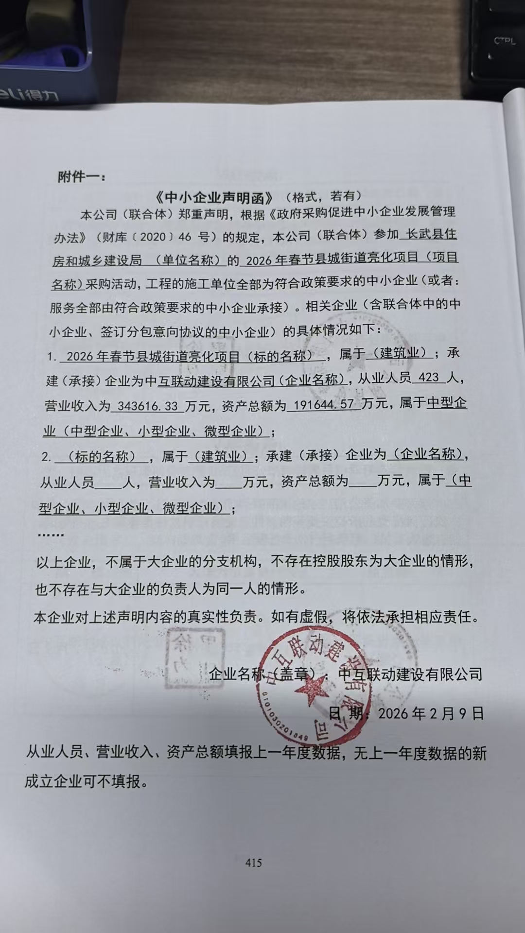 公告概要:| 公告信息: | | 采购项目名称 | 2026年春节县城街道亮化项目 | | 品目 | | | 采购单位 | 长武县住房和城乡建设局 | | 行政区域 | 长武县 | 公告时间 | 2026年02月10日 09:11 | | 评审专家(单一来源采购人员)名单 | 张俊兴,柴玲霞,王冰 | | 总成交金额 | ¥258.375900 万元(人民币) | | 联系人及联系方式: | | 项目联系人 | 杨工 | | 项目联系电话 | 029-88680215 | | 采购单位 | 长武县住房和城乡建设局 | | 采购单位地址 | 长武县东大街030号 | | 采购单位联系方式 | 18191062355 | | 代理机构名称 | 陕西恒鑫轩泽项目管理有限公司 | | 代理机构地址 | 陕西省西咸新区沣西新城沣西国际大厦1号楼 9层901室 | | 代理机构联系方式 | 029-88680215 | | 附件: | | 附件1 | 长武县住房和城乡建设局2026年春节县城街道亮化项目中标(成交)明细.pdf | | 附件2 | 磋商文件-长武亮化.pdf | | 附件3 | 中小企业声明函.jpg |
