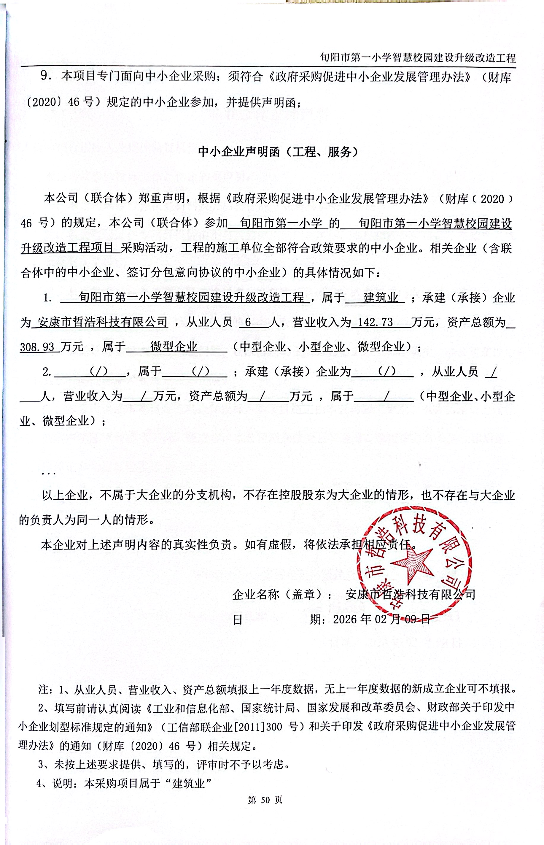 公告概要:| 公告信息: | | 采购项目名称 | 智慧校园建设升级改造工程 | | 品目 | | | 采购单位 | 旬阳市第一小学 | | 行政区域 | 旬阳县 | 公告时间 | 2026年02月10日 08:53 | | 评审专家(单一来源采购人员)名单 | 湛宣宝,方小兵,许媛 | | 总成交金额 | ¥31.160000 万元(人民币) | | 联系人及联系方式: | | 项目联系人 | 彭偲 | | 项目联系电话 | 15509289000 | | 采购单位 | 旬阳市第一小学 | | 采购单位地址 | 旬阳市城关镇人民北路65号 | | 采购单位联系方式 | 13891581972 | | 代理机构名称 | 安康市兴盛工程造价咨询有限公司 | | 代理机构地址 | 旬阳市商贸大街四巷一单元201 | | 代理机构联系方式 | 15509289000 | | 附件: | | 附件1 | 旬阳市第一小学智慧校园建设升级改造工程中标(成交)明细.pdf | | 附件2 | 磋商文件.doc | | 附件3 | 中小企业声明函.jpg |