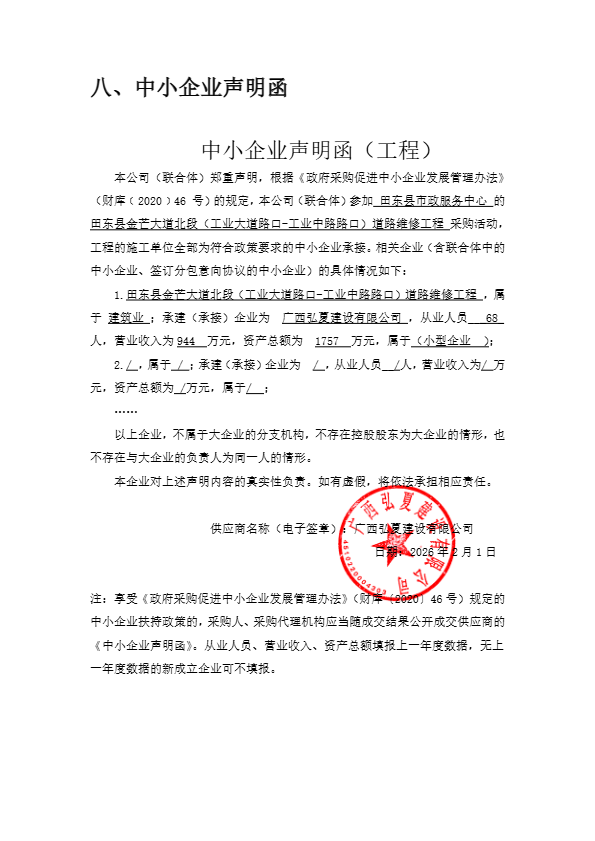 一、项目编号:BSZC2026-C2-220007-XYGS 二、项目名称:田东县金芒大道北段(工业大道路口-工业中路路口)道路维修工程 三、中标(成交)信息 1.中标结果: | 序号 | 中标(成交)金额(元) | 中标供应商名称 | 中标供应商地址 | | 1 | 报价:3641695.91(元) | 广西弘夏建设有限公司 | 田东县平马镇石化工业园区工业中路(研发中心楼) |
