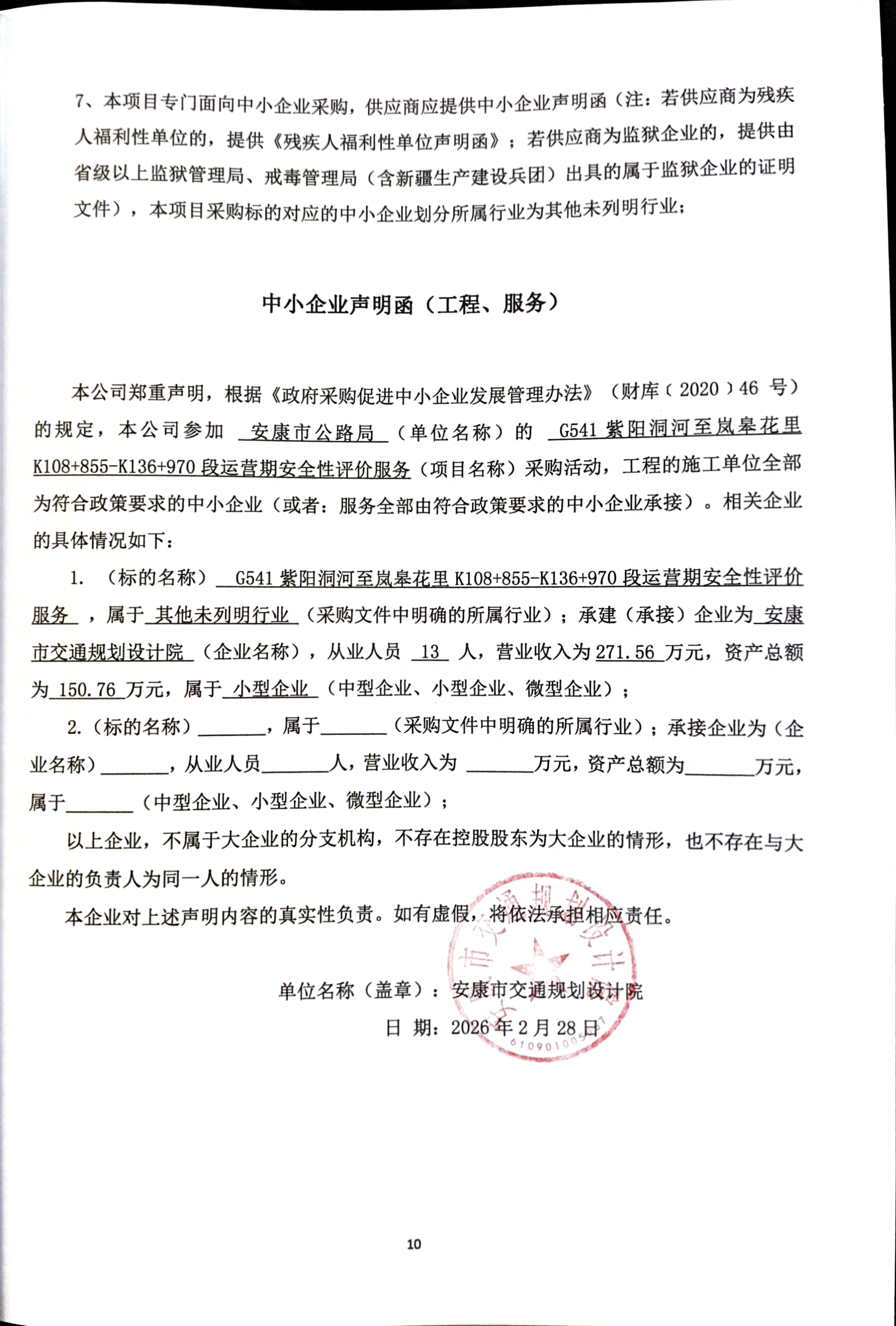 公告概要:| 公告信息: | | 采购项目名称 | G541紫阳洞河至岚皋花里K108+855-K136+970段运营期安全性评价服务 | | 品目 | | | 采购单位 | 安康市公路局 | | 行政区域 | 安康市 | 公告时间 | 2026年02月28日 16:56 | | 评审专家(单一来源采购人员)名单 | 宋丹,夏平,程后秀 | | 总成交金额 | ¥19.600000 万元(人民币) | | 联系人及联系方式: | | 项目联系人 | 徐工 | | 项目联系电话 | 18628055183 | | 采购单位 | 安康市公路局 | | 采购单位地址 | 陕西省安康市汉滨区巴山中路101号 | | 采购单位联系方式 | 13700259270 | | 代理机构名称 | 陕西正恒忠卫工程管理服务有限公司 | | 代理机构地址 | 陕西省安康市汉滨区江北大道汉城国际二号楼一单元1002室 | | 代理机构联系方式 | 18628055183 | | 附件: | | 附件1 | 安康市公路局G541紫阳洞河至岚皋花里K108+855-K136+970段运营期安全性评价服务中标(成交)明细.pdf | | 附件2 | 中小企业声明函.jpg |