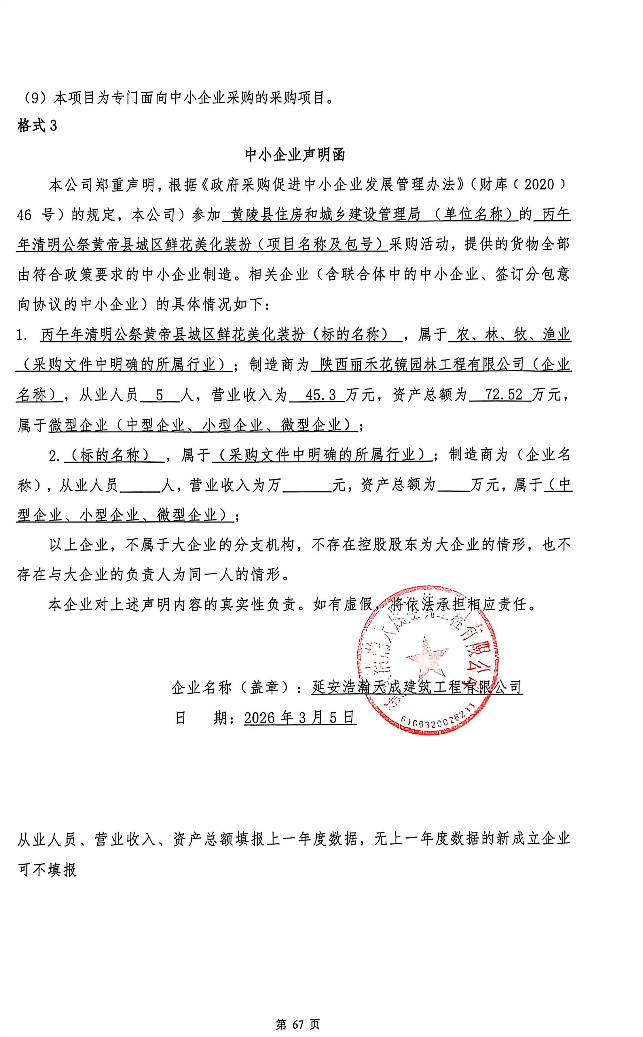 公告概要:| 公告信息: | | 采购项目名称 | 丙午年清明公祭黄帝县城区鲜花美化装扮 | | 品目 | | | 采购单位 | 黄陵县住房和城乡建设管理局 | | 行政区域 | 黄陵县 | 公告时间 | 2026年03月05日 18:03 | | 评审专家(单一来源采购人员)名单 | 郭娜,张艳顼,王秀 | | 总成交金额 | ¥47.000000 万元(人民币) | | 联系人及联系方式: | | 项目联系人 | 张改霞、 王婧 | | 项目联系电话 | 18291188695、15332551208 | | 采购单位 | 黄陵县住房和城乡建设管理局 | | 采购单位地址 | 黄陵县中心广场 | | 采购单位联系方式 | 13991786870 | | 代理机构名称 | 陕西中桓国际项目管理有限公司 | | 代理机构地址 | 陕西省西安市未央区凤城七路长和国际A座25层 | | 代理机构联系方式 | 18291188695 | | 附件: | | 附件1 | 中小企业声明函.jpg | | 附件2 | 黄陵县住房和城乡建设管理局丙午年清明公祭黄帝县城区鲜花美化装扮中标(成交)明细.pdf |