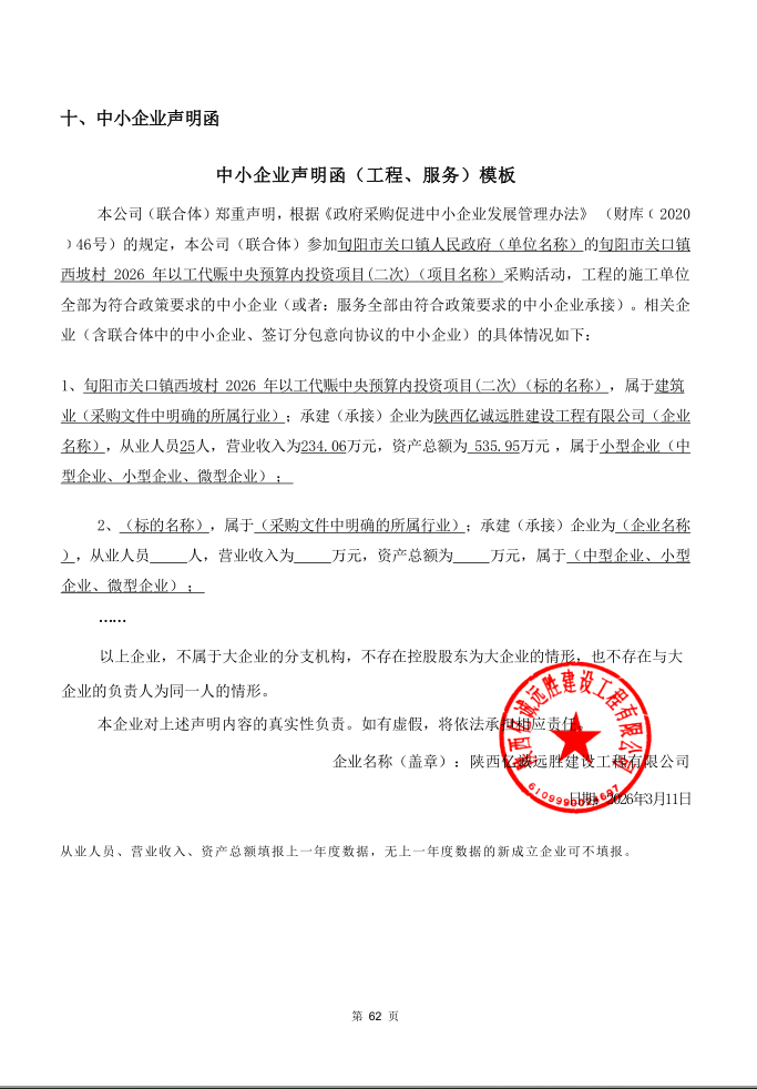 四、主要标的信息合同包1(旬阳市关口镇西坡村2026年以工代赈中央预算内投资项目): 工程类(陕西亿诚远胜建设工程有限公司)