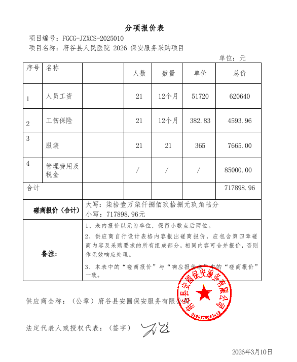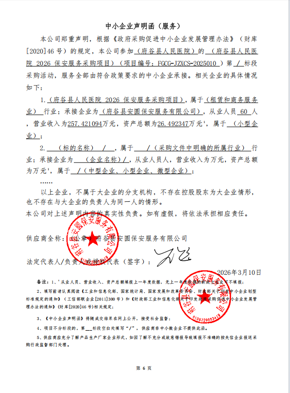 七、公告期限自本公告发布之日起1个工作日。 八、其他补充事宜未中标原因:府谷县万家园物业管理有限公司信用中国(陕西榆林)平台截图内容与磋商文件要求不符,资格审查不通过;府谷县金盾保安服务公司、神木市保安服务有限公司均未提供磋商内容中要求提供的承诺书,不满足磋商文件要求,未通过符合性审查;府谷县宏鹰保安有限公司综合得分排名不是第一,未中标;府谷县鸿雄保安服务有限公司综合得分排名不是第一,未中标。 九、凡对本次公告内容提出询问,请按以下方式联系。1.采购人信息名称:府谷县人民医院 地址:府谷县康复路上巷2号 联系方式:15353387882 2.采购代理机构信息名称:府谷县政府投资和采购服务中心 地址:陕西省榆林市府谷县府谷县新区财税中心11楼 联系方式:13488346234 3.项目联系方式项目联系人:高工 电话:13488346234 府谷县政府投资和采购服务中心 2026年03月13日 相关公告 | ||||||||||||||||||||||||||||||||||||||||||||||||||||||||||||||||||||||||||||||||||||||||||||||||||||||||||||||||||||||||