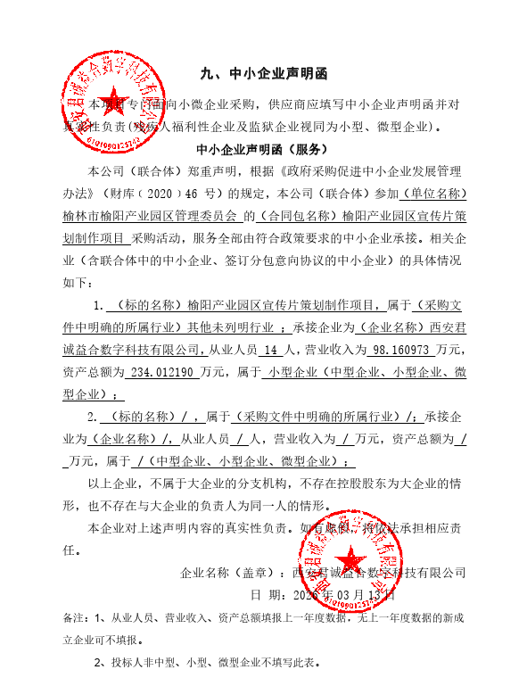 一、项目编号:YLDKLCG-2026-03 二、项目名称:榆阳产业园区宣传片策划制作项目 三、采购结果 采购包1: | 供应商名称 | 供应商地址 | 中标(成交)金额 | 评审价格 | | 西安君诚益合数字科技有限公司 | 陕西省西安市高新区高新三路2号海佳云顶1幢2单元9层20901号 | 258,000.00元 | 258,000.00元 | 四、主要标的信息 合同包1(榆阳产业园区宣传片策划制作项目): 服务类(西安君诚益合数字科技有限公司) | 品目号 | 品目名称 | 采购标的 | 服务范围 | 服务要求 | 服务时间 | 服务标准 | 金额(元) | | 1 | 音像制作服务 | 榆阳产业园区宣传片策划制作项目 | 满足采购文件要求 | 符合国家行业标准要求 | 满足采购文件要求 | 符合国家行业标准要求 | 258,000.00 | 五、评审专家(单一来源采购人员)名单: 六、代理服务收费标准及金额: | 代理服务收费标准及金额 | | | 合同包号 | 合同包名称 | 代理服务费金额(万元) | 收取对象 | | 1 | 榆阳产业园区宣传片策划制作项目 | 0.3096 | 中标(成交)供应商 | 七、公告期限 自本公告发布之日起1个工作日。 八、其他补充事宜 九、凡对本次公告内容提出询问,请按以下方式联系。 1.采购人信息 名称:榆林市榆阳产业园区管理委员会 地址:榆阳区高新技术产业开发区 联系方式:15619909155 2.采购代理机构信息 名称:榆林达康隆项目管理有限公司 地址:陕西省榆林市榆阳区陕西省榆林市高新技术产业园区榆林大道锦园新世纪C4-1-202商铺 联系方式:18098050903 3.项目联系方式 项目联系人:榆林达康隆项目管理有限公司 电话:18098050903 榆林达康隆项目管理有限公司 2026年03月16日 |