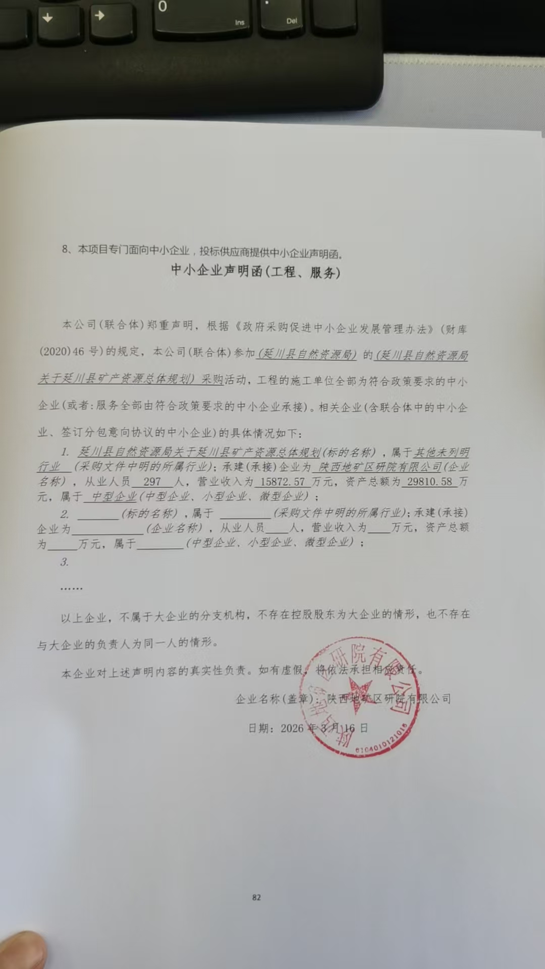 公告概要:| 公告信息: | | 采购项目名称 | 延川县矿产资源总体规划 | | 品目 | | | 采购单位 | 延川县自然资源局 | | 行政区域 | 延川县 | 公告时间 | 2026年03月19日 14:01 | | 评审专家(单一来源采购人员)名单 | 张海京,霍保卫,张玮 | | 总成交金额 | ¥18.600000 万元(人民币) | | 联系人及联系方式: | | 项目联系人 | 孙工 | | 项目联系电话 | 0911-8331531 | | 采购单位 | 延川县自然资源局 | | 采购单位地址 | 延川县堂坡 | | 采购单位联系方式 | 15891414560 | | 代理机构名称 | 延川县政府采购中心 | | 代理机构地址 | 陕西省延安市延川县延川县河东财政办公大楼(延川县财政局1楼) | | 代理机构联系方式 | 0911-8331531 | | 附件: | | 附件1 | 磋商文件.doc | | 附件2 | 中小企业声明函.jpg | | 附件3 | 延川县自然资源局延川县矿产资源总体规划中标(成交)明细.pdf |