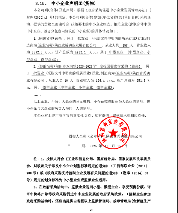旬阳市双河镇2025-2026学年度校园餐食材采购(蔬菜)中标(成交)结果公告