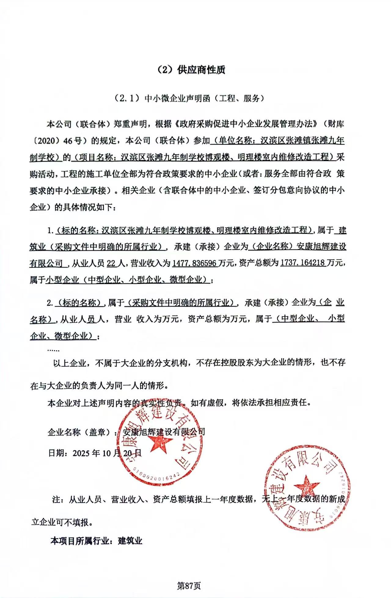 汉滨区张滩九年制学校博观楼、明理楼室内维修改造工程中标(成交)结果公告