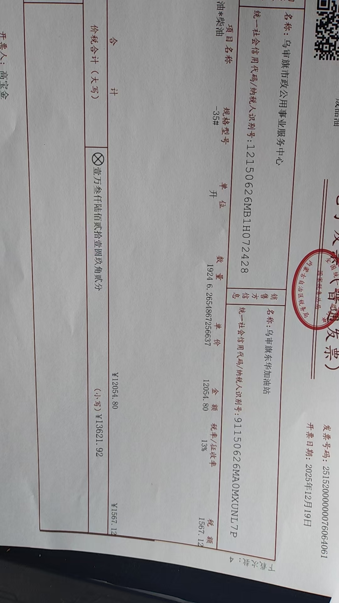 乌审旗市政公用事业服务中心2025年嘎鲁图镇农村牧区生活垃圾收运处理一体化燃油费12政府采购
