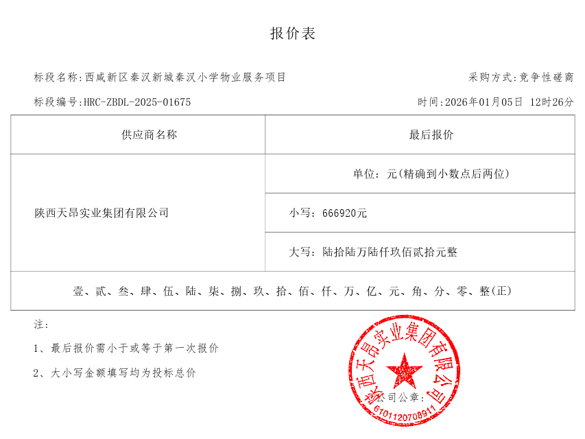 西咸新区秦汉新城秦汉小学物业服务项目成交结果公告