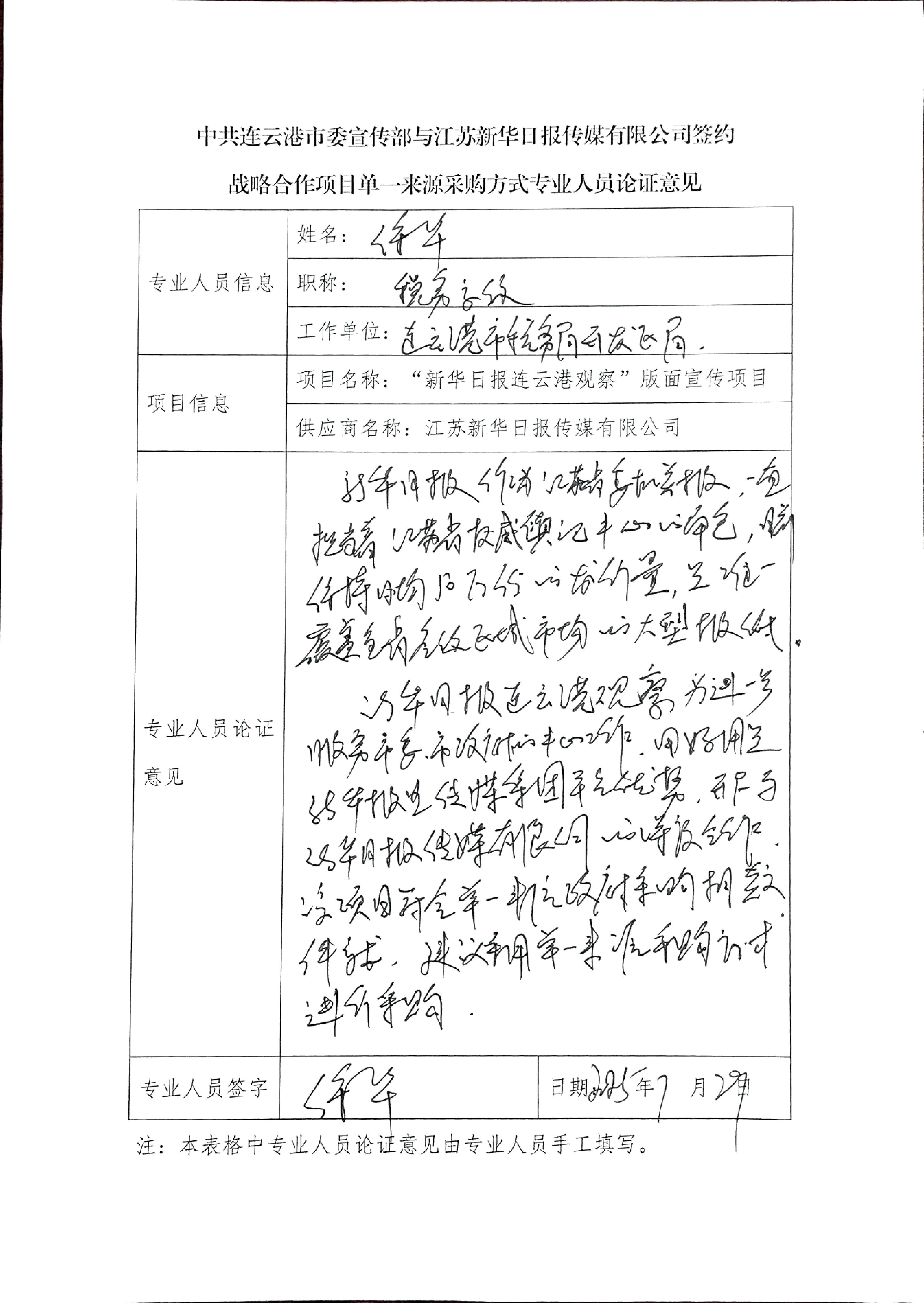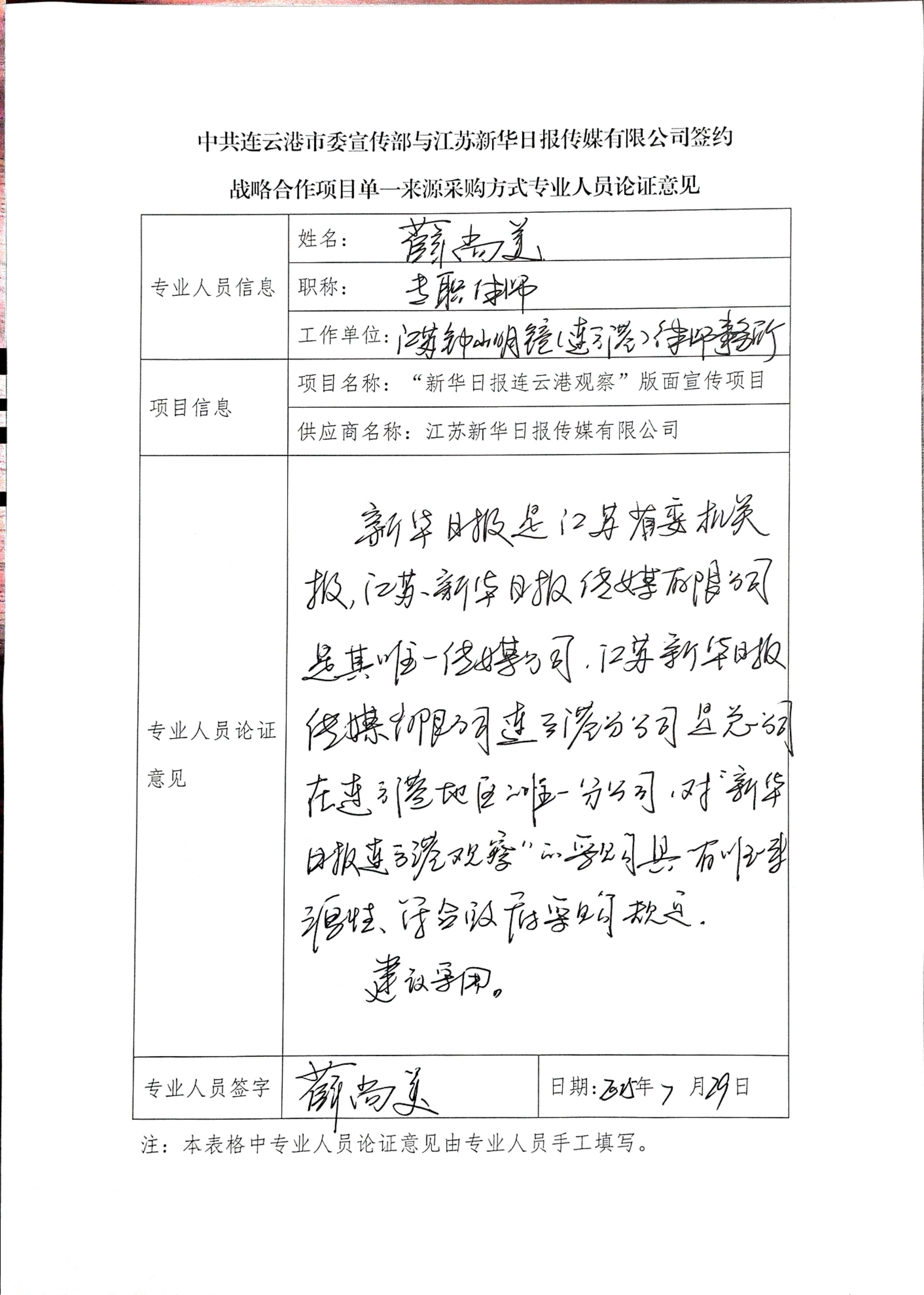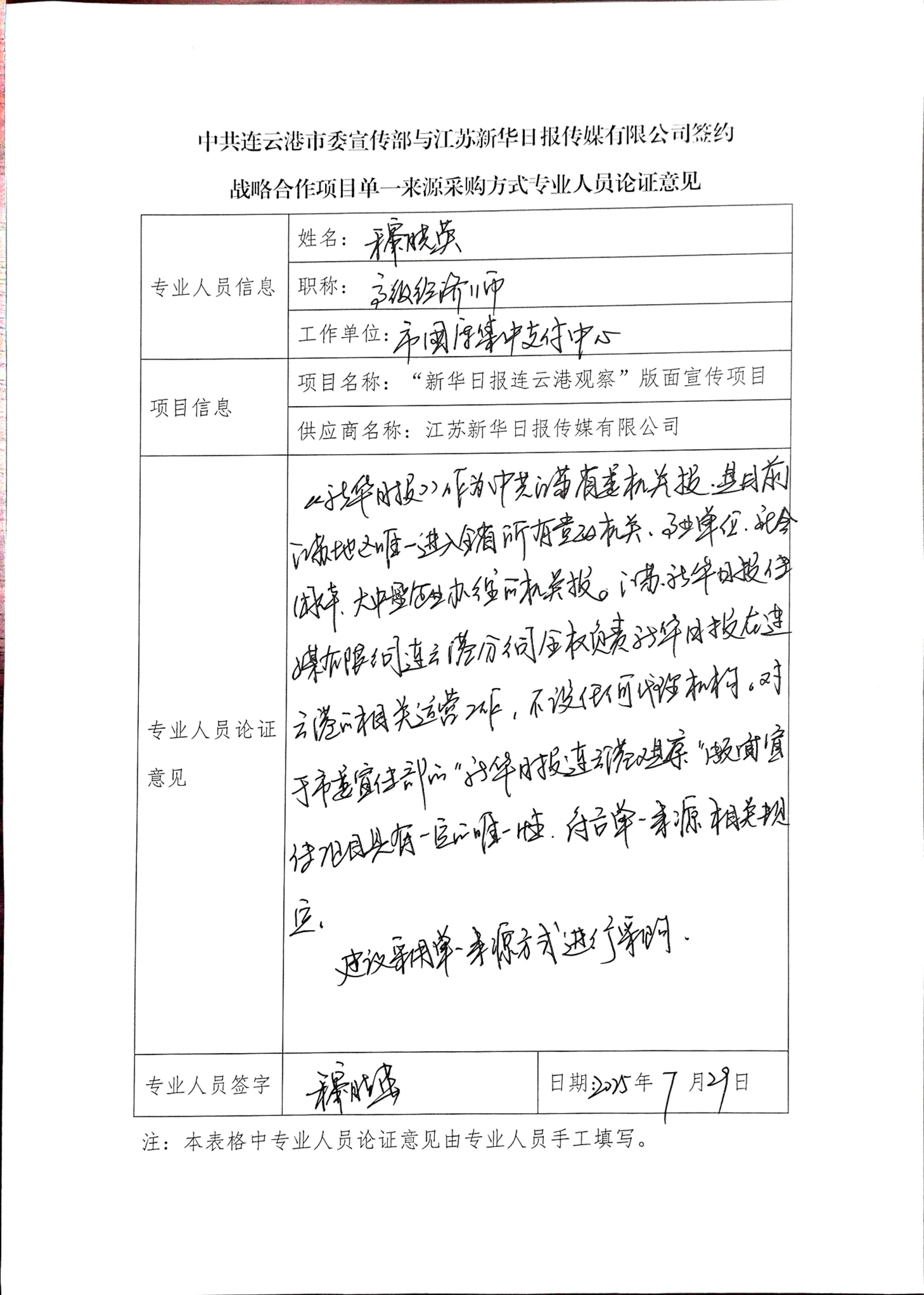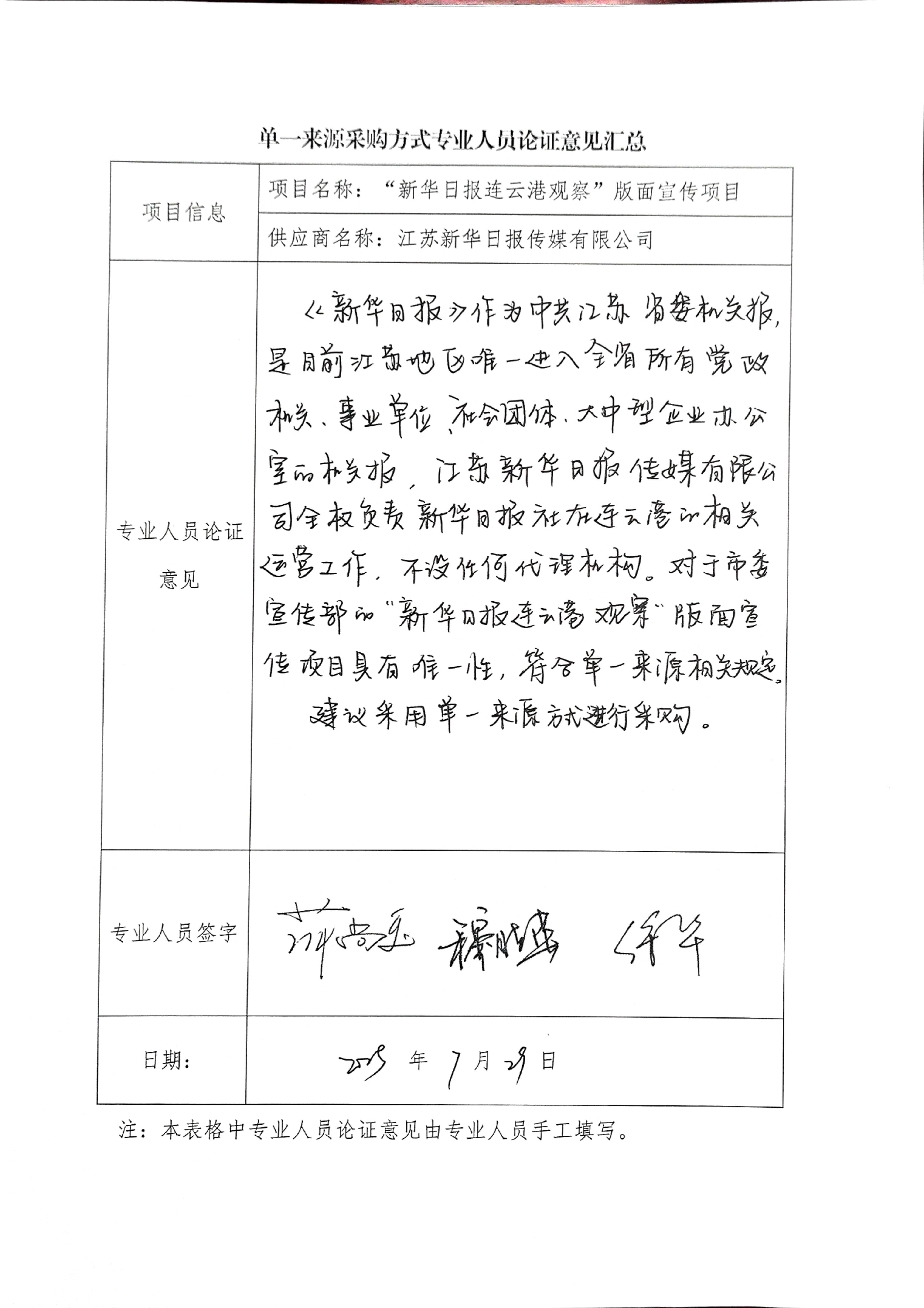 采用单一来源采购方式的原因及相关说明:新华报业传媒集团是以江苏省委机关报《新华日报》为龙头组建的党报集团。近年来,新华报业传媒集团不断开创新闻舆论工作新局面,已从一张报纸发展成为现代化全媒体集团。同时,新华报业传媒集团媒体融合步伐加快,构建起党报求“深”、客户端求“快”、网站求“全”、全媒体求“融”的现代传播体系,“交汇点”等客户端各具特色、错位发展,“学习强国”江苏学习平台建设走在全国省级平台前列。作为中共江苏省委机关报,《新华日报》一直担当着江苏省权威舆论中心的角色,深受读者喜爱。目前,《新华日报》保持着日均超50万份的发行量,是目前江苏地区唯一进入全省所有党政机关、事业单位、社会团体、大中型企业办公室的机关报,也是唯一覆盖全省各级区域市场,到达县城、农村乡镇和村民委员会的大型报纸。按国际传播学界通行办法测算,《新华日报》的常年稳定读者近1000万人。新华日报传媒有限公司拥有新华报业传媒集团旗下新华日报、交汇点、新华报业网等报、网、端、微全媒体宣传资源矩阵。其中《新华日报》是江苏省委机关报,连续多年入选“世界媒体500强”;交汇点新闻是“新闻+服务”移动客户端,提供重大新闻发布、重要政策解读、民生新闻推送等适合移动端阅读的原创新闻,为全国新媒体(客户端)四十强。《新华日报·连云港观察》版面由江苏新华日报传媒有限公司全权负责采编发,承担《新华日报·连云港观察》报纸版面出版全部工作。江苏新华日报传媒有限公司全权负责新华日报社在连云港的相关运营工作。 综上所述,本项目符合中华人民共和国采购法第三十一条第(一)款有关规定,拟采用单一来源采购方式采购。