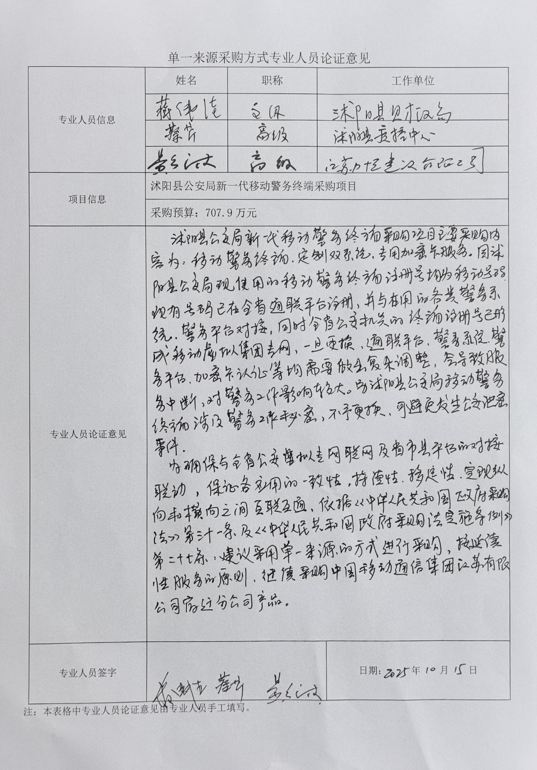 采用单一来源采购方式的原因及相关说明:沭阳县公安局新一代移动警务终端采购项目主要采购内容为:移动警务终端、定制双系统、专用加密卡服务。 因沭阳县公安局现使用的移动警务终端注册号均为移动号码,现有号码已在全省通联平台注册,并与在用的各类警务系统、警务平台对接,同时全省公安机关的终端注册号已形成移动虚拟集团专网,一旦更换,通联平台、警务系统、警务平台、加密卡认证等均需要做出复杂调整,会导致服务中断,对警务工作影响较大。另沭阳县公安局移动警务终端涉及警务工作秘密,不予更换,可避免发生公安泄密事件。为确保与全省公安虚拟专网联网及省市县平台的对接联动等诸多因素,保证各应用的一致性、持续性、稳定性,实现纵向和横向之间互联互通,依据《中华人民共和国政府采购法》第三十一条及《中华人民共和国政府采购法实施条例》第二十七条:建议采用单一来源的方式进行采购,按延续性服务原则,继续采购中国移动通信集团江苏有限公司宿迁分公司产品。