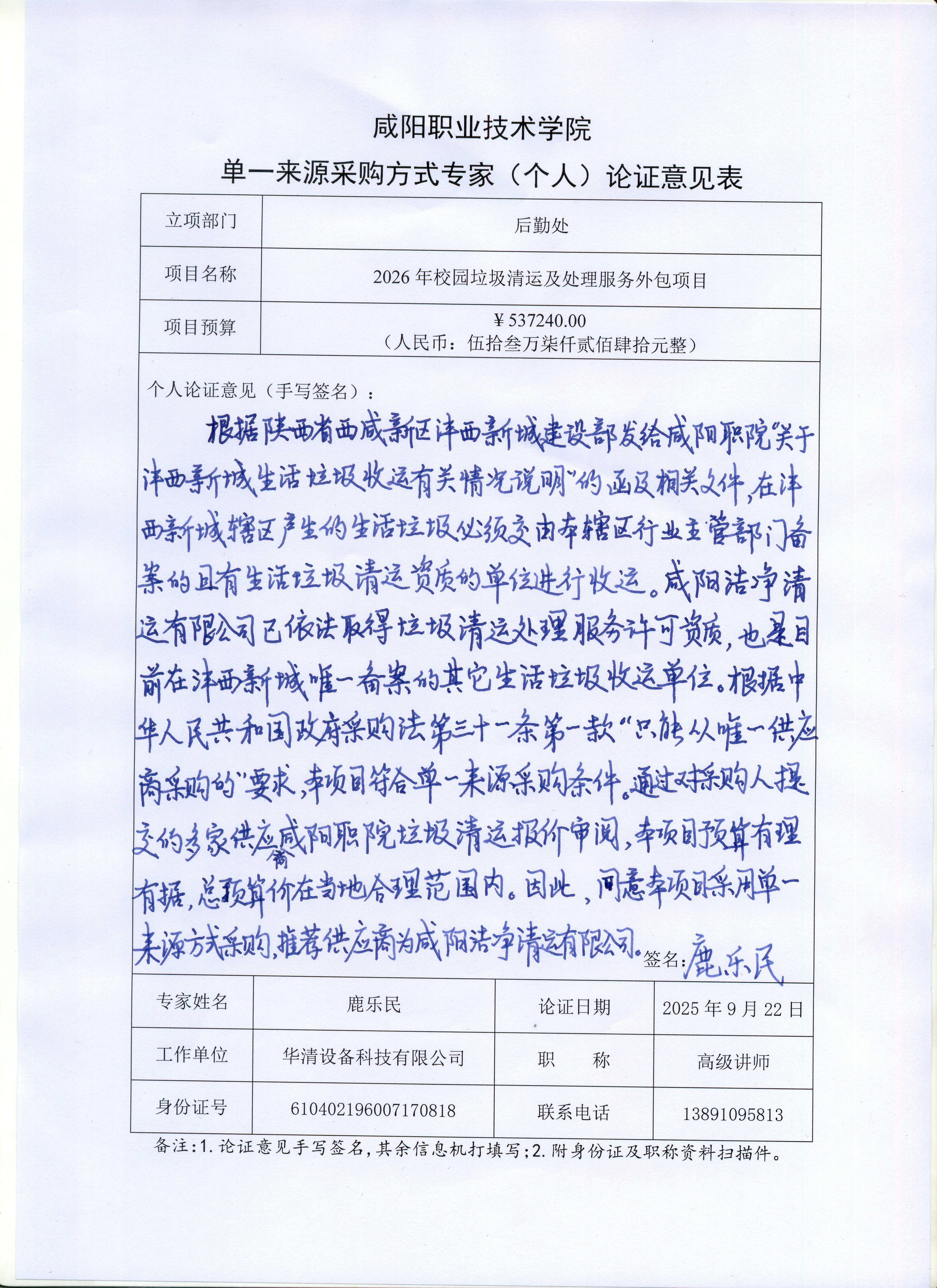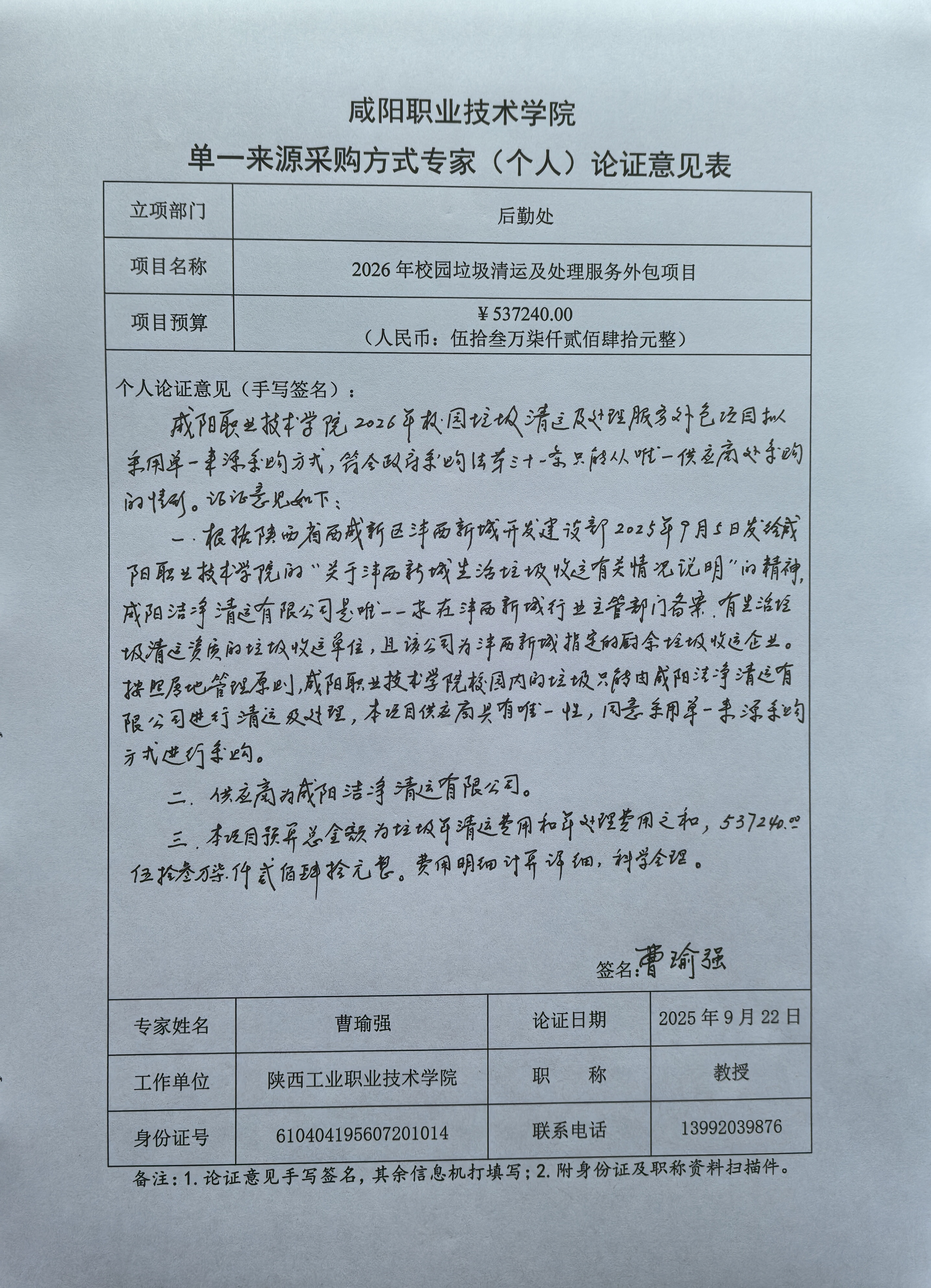 2026年校园垃圾清运及处理服务、 1项、 预算金额 537,240.00元