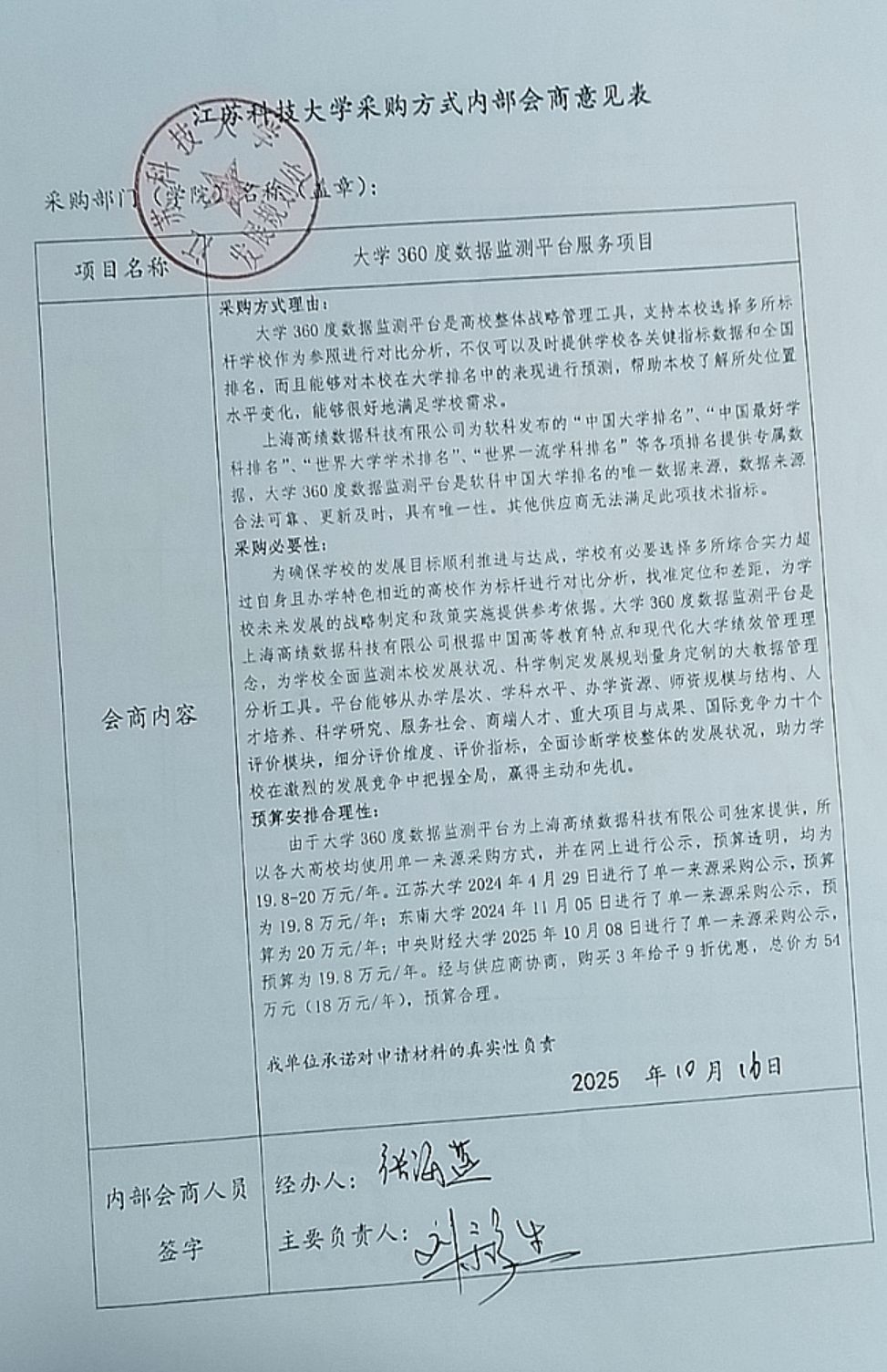 鉴于上述情况,大学 360度数据监测平台是高绩自主开发的高校整体战略管理工具,具备独立的知识产权,上海高绩数据科技有限公司为软科发布的“中国大学排名”提供专属数据,大学360度数据监测平台是软科发布的年度中国大学排名的唯一数据来源渠道,数据来源合法可靠、更新及时,此服务只能从唯一供应商处采购,故项目不宜进行其他采购方式,须采用单一来源采购方式。