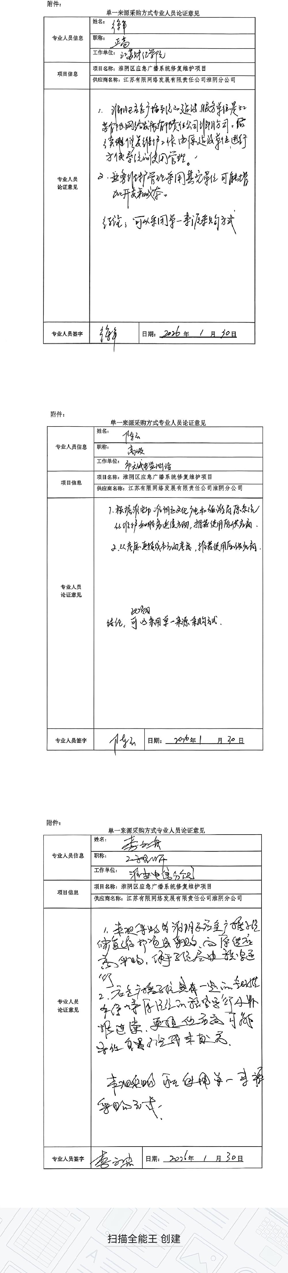 采用单一来源采购方式的原因及相关说明:淮阴区应急广播系统的建设服务单位是江苏有限网络发展有限责任公司淮阴分公司,后续修复维护运行工作由原建设单位进行,方便系统的使用管理。业务维护管理采用其他供应商可能增加开支和成本。基于以上原因,拟对淮阴区应急广播系统修复维护项目采用单一来源方式采购,以确保项目顺利实施。