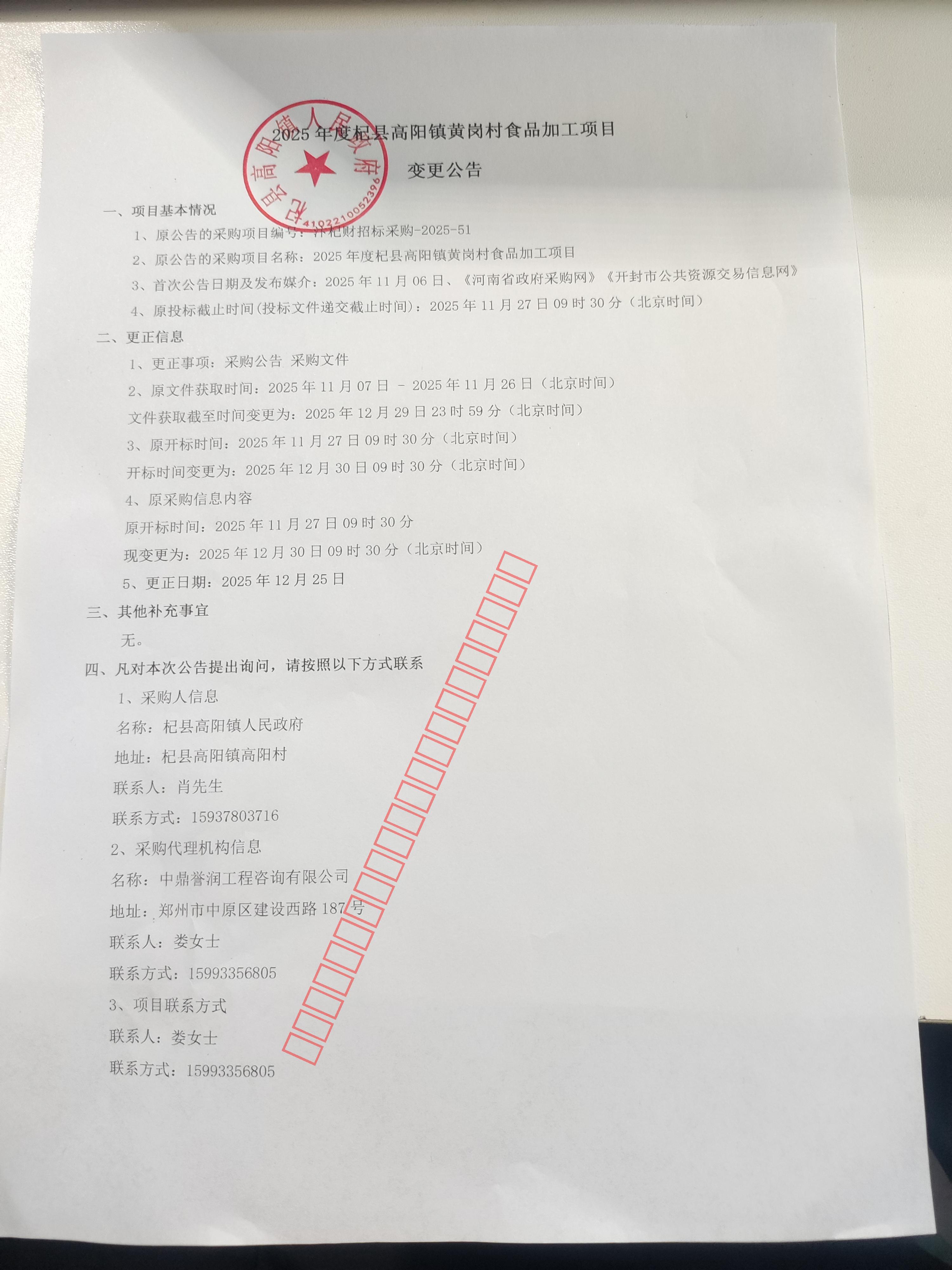 2 、原公告的采购项目名称: 2025年度杞县高阳镇黄岗村食品加工项目