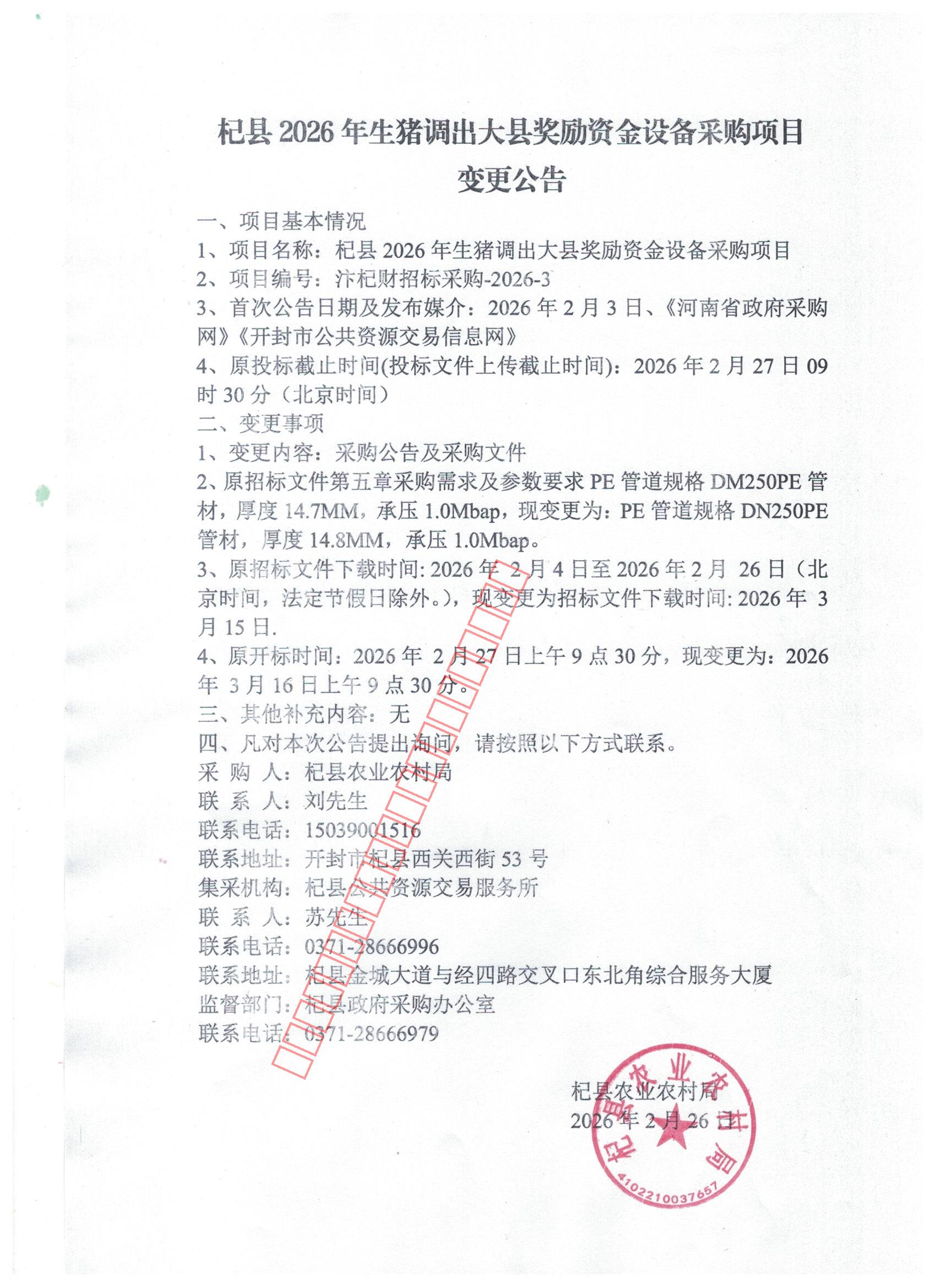 1 、项目名称:杞县 2026 年生猪调出大县奖励资金设备采购项目